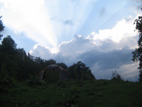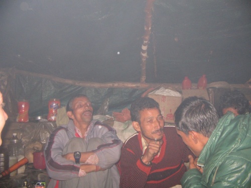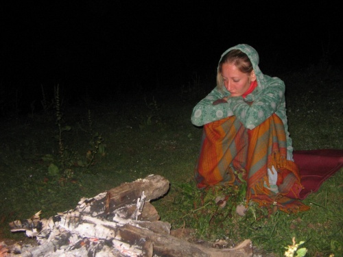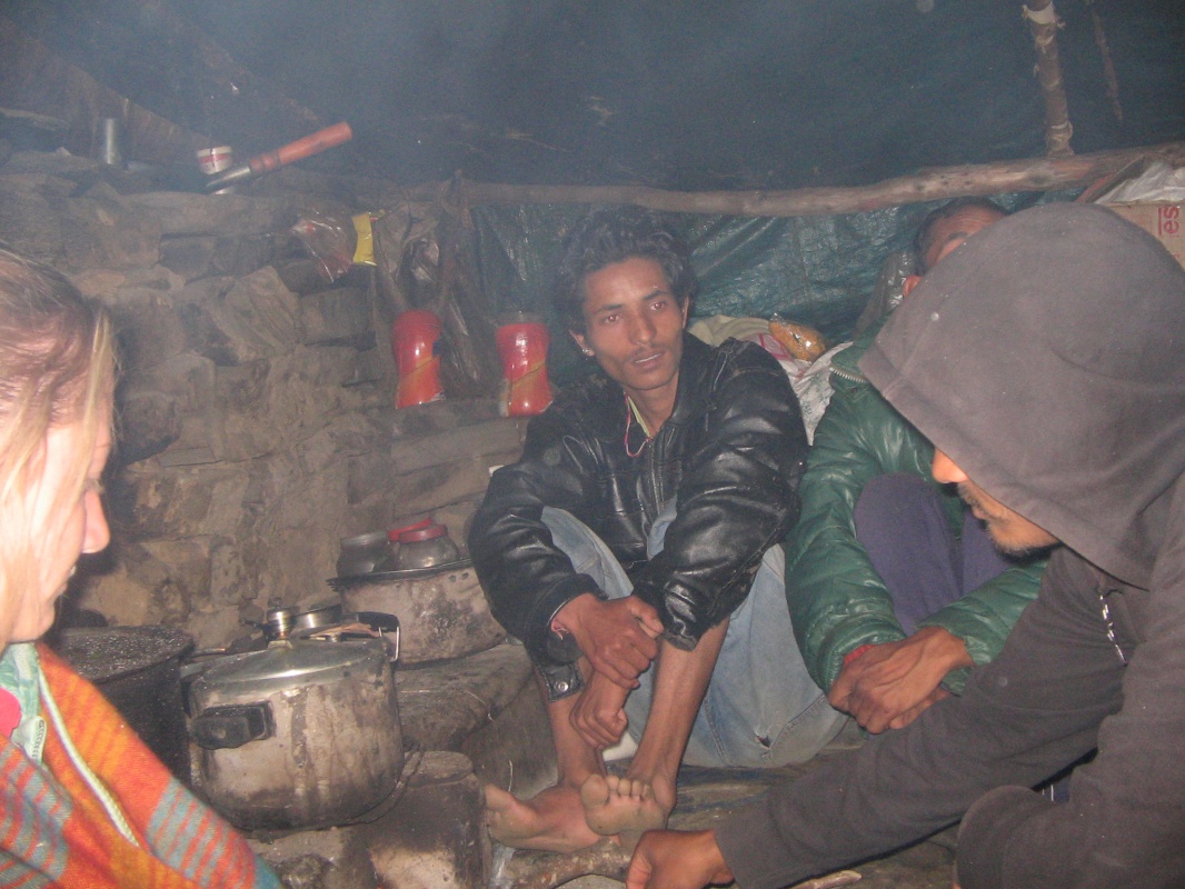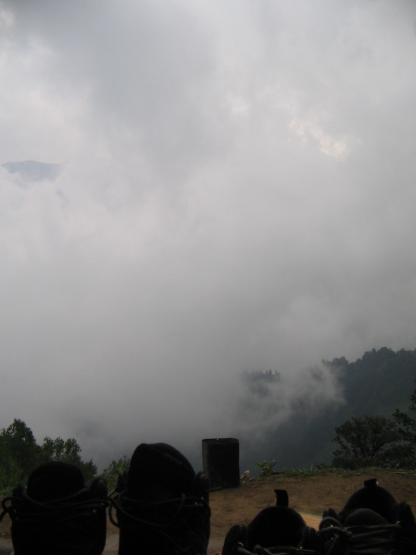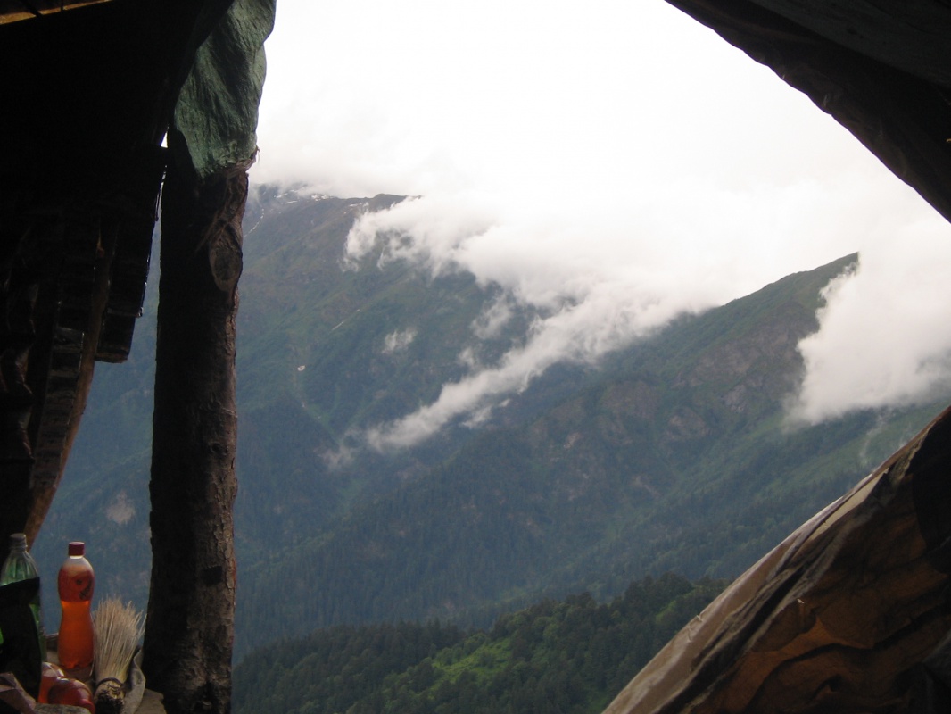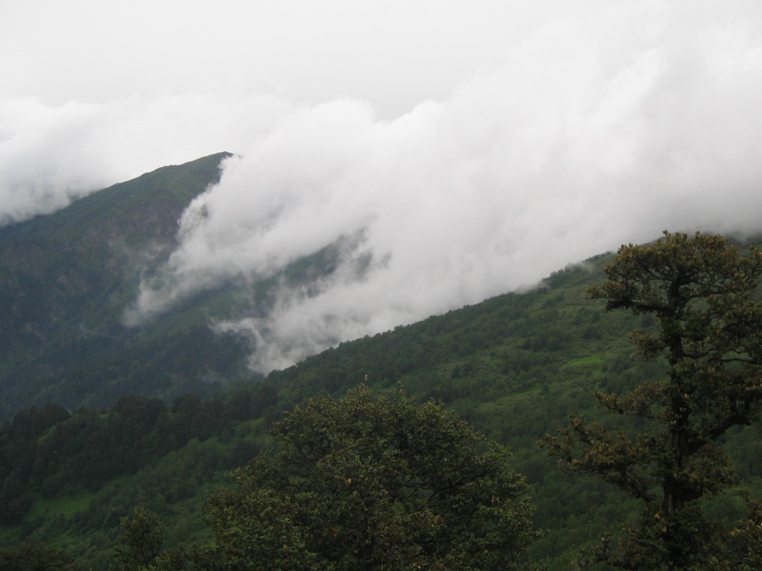 Когда мы подходили,палатки были уже разбиты вблизи пастушьего не то шалаша,не то навеса,не то хижины. Остатки каменной кладки сверху затянуты традиционной желтой и синей полиэтиленовой пленкой. Внутри очаг,тепло,но очень дымно,т.к трубы нет,дым выходит в дверь.И тут начался дождь. Мы сидели у очага,грелись и радовались,что успели дойти сухими. А потом нас накрыло. Облаком.И мы были как ёжики в тумане.Туман наступал,отступал,струился,повисал клочьями,уплотнялся,редел,вытягивал щупальца.Из тумана доносилось ржание коней и высовывались лошадиные головы.. А мы пили чай,курили,ели.Уснули под журчание горного ручья в 2-х шагах от головы. Это лучшая была колыбельная музыка.