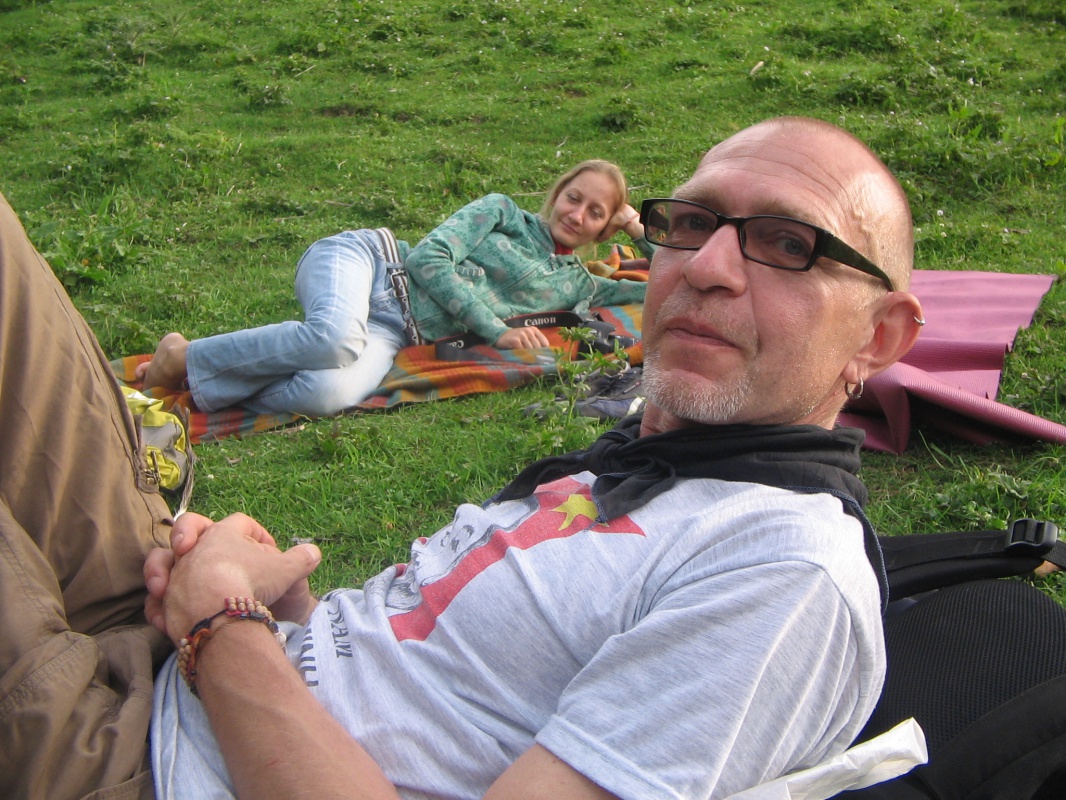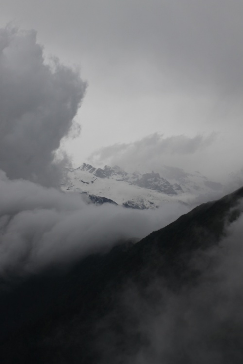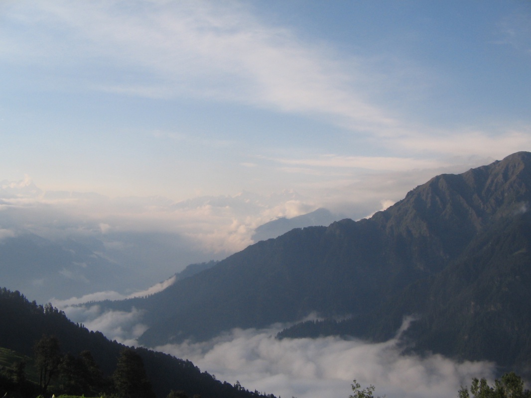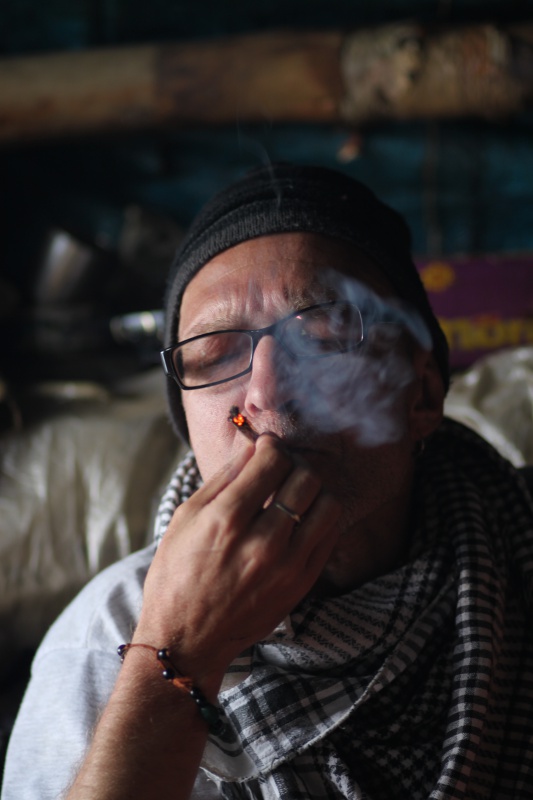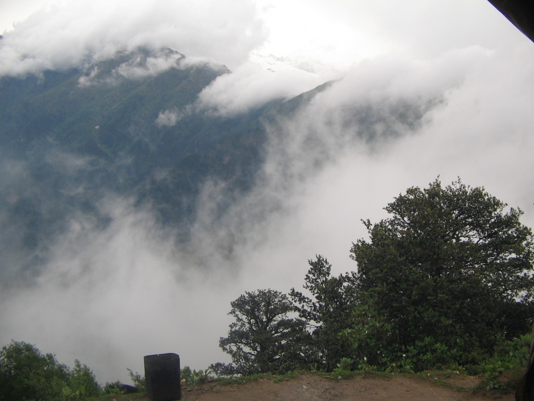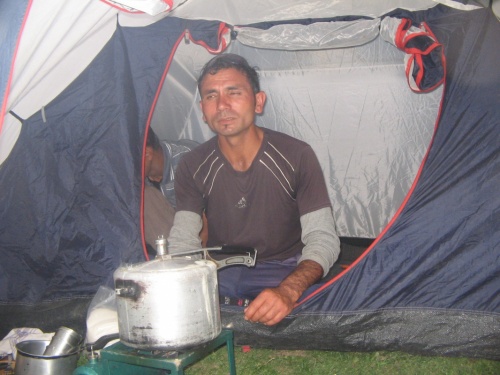Когда мы подходили,палатки были уже разбиты вблизи пастушьего не то шалаша,не то навеса,не то хижины. Остатки каменной кладки сверху затянуты традиционной желтой и синей полиэтиленовой пленкой. Внутри очаг,тепло,но очень дымно,т.к трубы нет,дым выходит в дверь.И тут начался дождь. Мы сидели у очага,грелись и радовались,что успели дойти сухими. А потом нас накрыло. Облаком.И мы были как ёжики в тумане.Туман наступал,отступал,струился,повисал клочьями,уплотнялся,редел,вытягивал щупальца.Из тумана доносилось ржание коней и высовывались лошадиные головы.. А мы пили чай,курили,ели.Уснули под журчание горного ручья в 2-х шагах от головы. Это лучшая была колыбельная музыка.