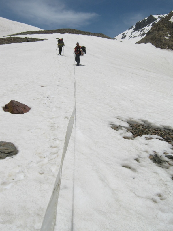 Голова пустая. Мыслей нет совсем,только ищешь место куда поставить ногу,делая следующий шаг. Динамическая випассана.Сердце колотится уже где-то в горле,голова кружится,ноги ватные,каждый шаг как будто бы тащишь прикованное к ноге ядро каторжника.Таблетку валидола под язык,отсиделся,успокоил сердце и снова пополз вверх по ослепительному снегу,задыхаясь в разряженном воздухе. Когда наступал совсем край,мне давали стропу и я или карабкался вверх,перебирая по ней руками,или петлю на пояс и Такпа тащил меня вверх как осла.