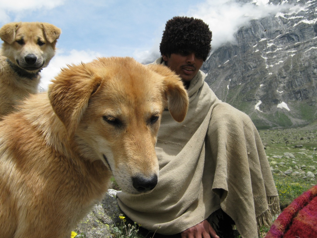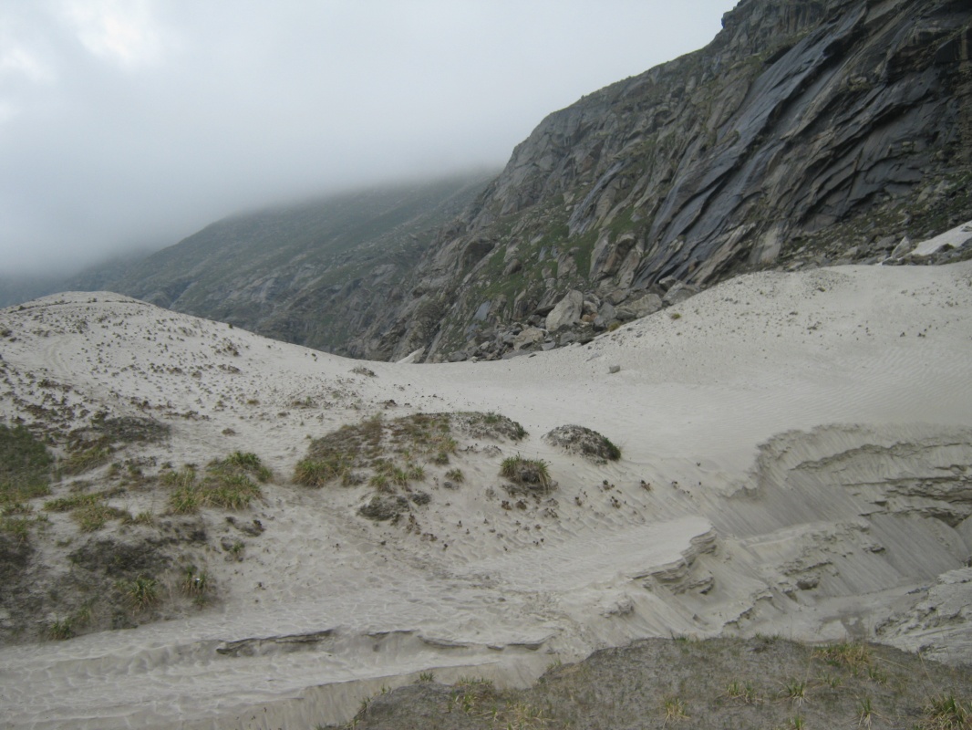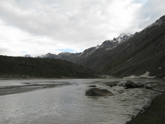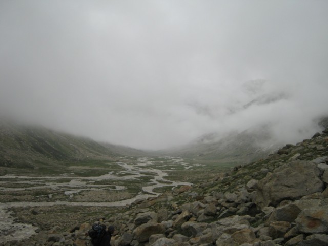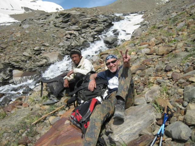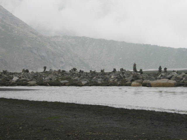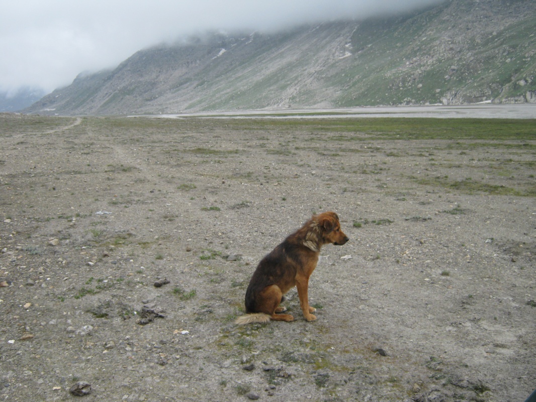 Мне легче спускаться,чем подниматься,хотя многие утверждают обратное. Но тут спуск был под стать остальному треку. Почти отвесно по скользкому снегу.Первым шел Викас и протаптывал ступеньки в снегу,затем Такпа сажал меня на закорки с сносил вниз на самых трудных участках,где я просто не мог спуститься физически. Это не люди,это Горные Машины. Или ползти низ по скале,а тот же Такпа страхуют снизу,принимая ступню в сложенную ладонь и перемещая ее на безопасный и прочный участок. Полз как человек-паук,ей Богу.Долина предстала какой-то тундрой. Тысячи ручьев,ручейков,речек,рек и озер,сливающихся шаг за шагом в Парвати. Под ногами хлюпает снег,вперемешку с песком,камнями и грязью. По руслам рек скатываются потоки селя,иногда приходится делать большой крюк,чтобы обойти опасное место. Гряда чхортенов на границе Манталая,Амбрелла-Баба,пришедший помолиться в святое место босиком,но с двумя зонтиками и первые пастухи и собаки. Огонь развести не из чего,если только собрать сухой ячий навоз,что мы и делали.
