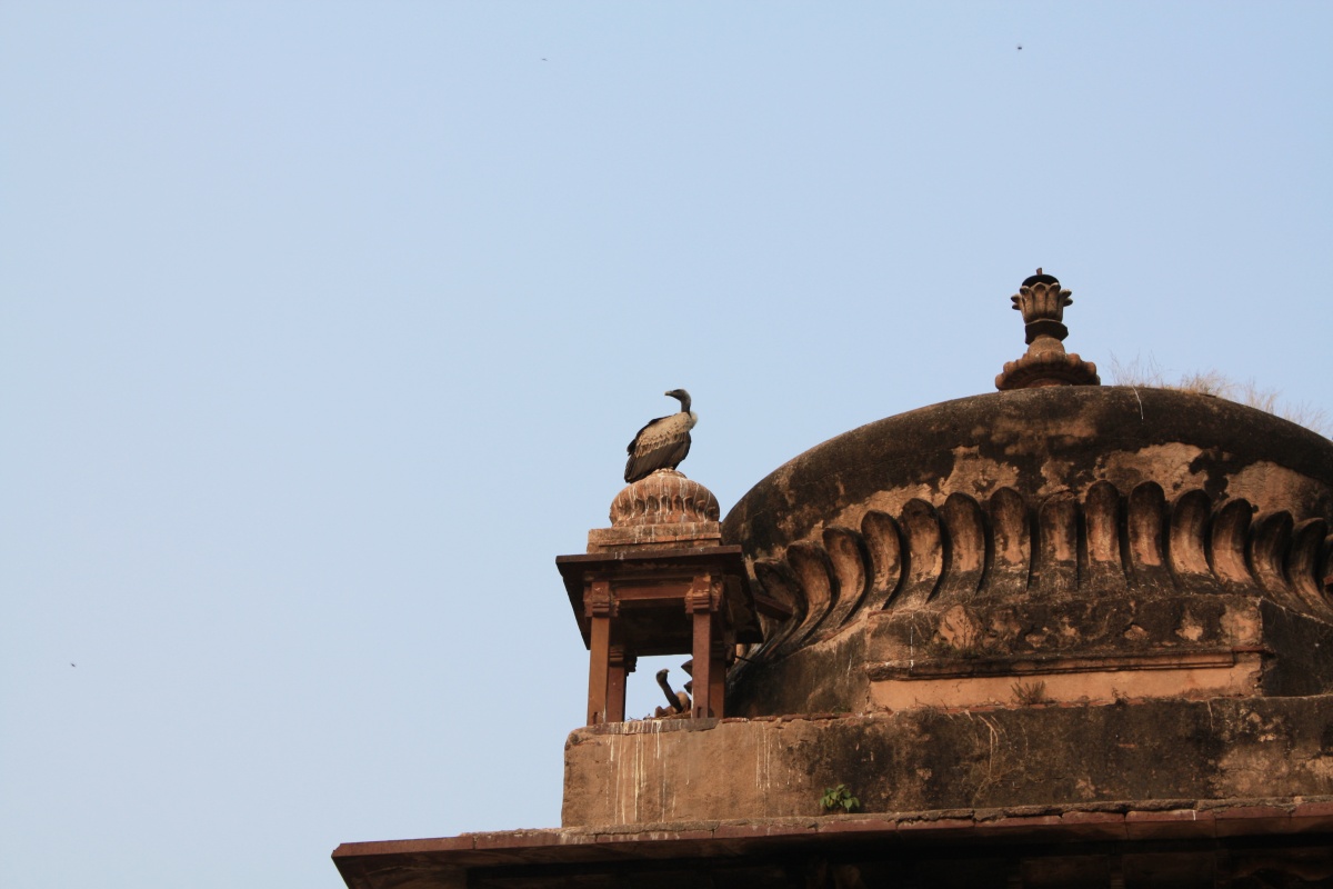 Про грифов надо рассказать отдельно. Забравшись однажды на крышу стоящего в центре Орчхи храма, мы впервые в жизни увидели грифов так близко. И не просто одного-двух грифов, кружащих в поднебесье, а всю семью в сборе: папа-гриф гордо расправлял крылья в лучах закатного солнца, мама-гриф, сидя в гнезде, ласково выклёвывала что-то с ещё неоперившегося птенца, который был розов и пушист и, к нашему удивлению, размером с большую кошку. Крыша храма вообще была густо населена - грифы делили свой "дом" с бесчисленным количеством ярко-зелёных попугаев и немаленькой стаей обезьян, с любопытством осматривавших нас с целью "чем-нибудь поживиться".