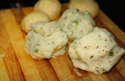 Когда картошка готова почистите шкурку. Потрите картошку на мелкую терку и разомните, добавьте соли и специй по вкусу. Добавляют чилли и зиру. Я добавляю аджвайн и колонжи зеленый лук.