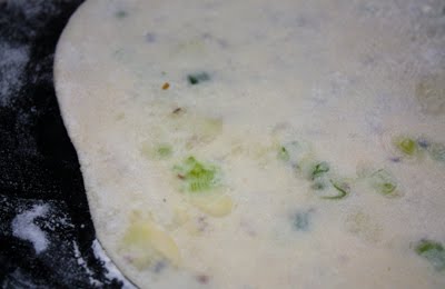 Дальше раскатываем тесто для параты как обычно, а потом добавляем картофельную массу в середину лепешки, аккуратно заворачиваем картошку конвертиком, и снова раскатываем лепешку. Есть несколько способов заворачивать индийцы делают круглую форму используя много защипов, а я раскатываю края потоньше и стараюсь не пересекать их по возможности. В общем тут как вам удобнее.