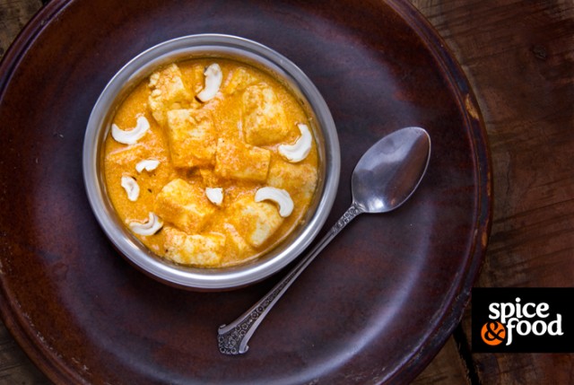 Потом. Нагрейте 1 ч. л. гхи на сковороде, на среднем огне. Пюре, пропущенное через сито, положите в сковороду, добавьте гарам масалу и готовьте, помешивая, пока смесь не увариться в густую пасту минут 5-10. Убавьте огонь. Добавьте оставшиеся сливки, молоко, изюм, посолите, перемешайте, попробуйте. Добавьте панир. Готовьте 3-5 минут. Готовое блюдо украсьте кешью и кориандром по вкусу.