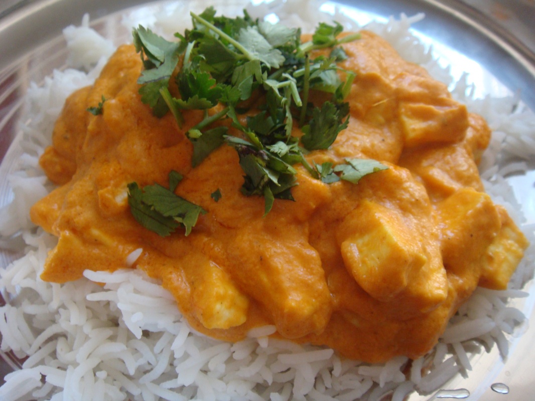 Сначала нагрейте половину гхи на сковороде, добавьте нарезанный лук, тертый имбирь, целый зеленый чилли, раскрошенный кардамон (без стручков). Прожарьте минут 5. Добавьте томаты, перемешайте и продолжайте готовить 7-8 минут. Добавьте красный перец (можно четверть чайной ложки) и куркуму. Добавьте 2 ложки сливок, кешью, перемешайте и продолжайте готовить 5 минут. Снимите смесь с огня и дайте остыть. Можно вытащить целый зеленый чилли, если не любите острое. Сделайте из смеси однородное пюре в блендере и пропустите результат через сито. Нежность подливы важна для качества блюда, так что сито обязательный процесс, хотя и занудный:)