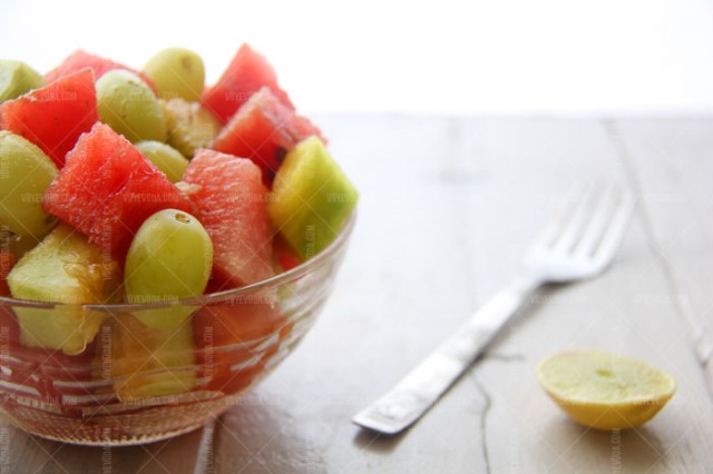 В салат идут арбуз, папайя, виноград, дыня и яблоко. (Тарбуж, папита, карбуж, ангур, яблоко не помню как по индийски, но оно и не в сезоне, и сорри за произношение:) Дрессинг для салата делается из сока 1 нимбу (лайма) и чат масалы. Черная соль добавляется по желанию, поскольку она уже есть в составе чат масалы.