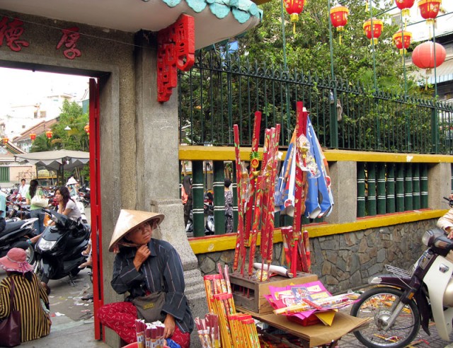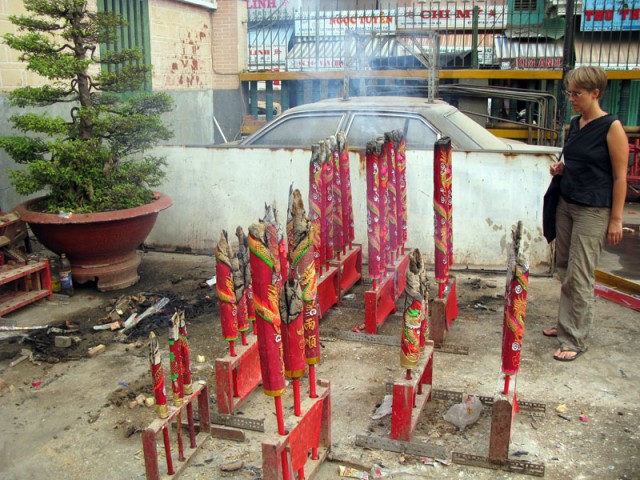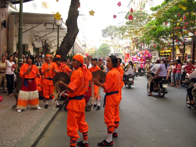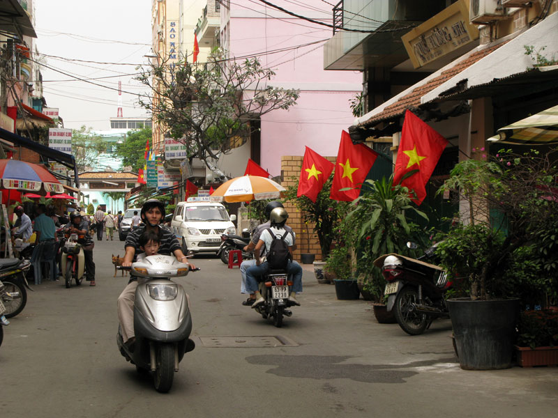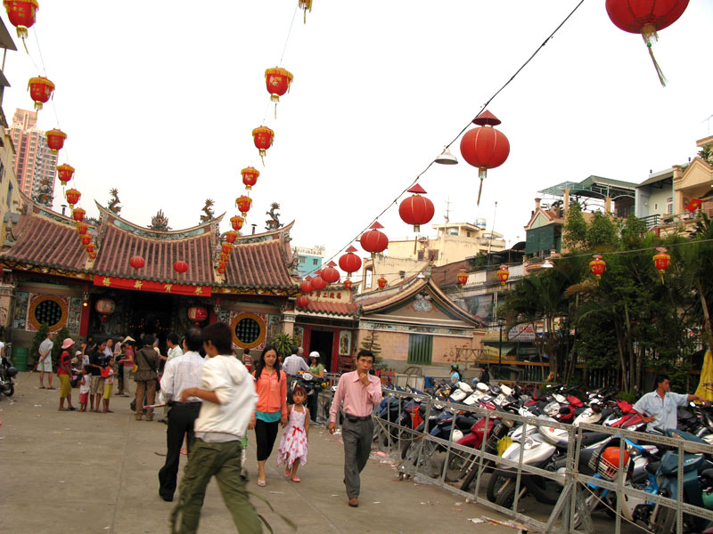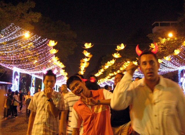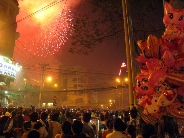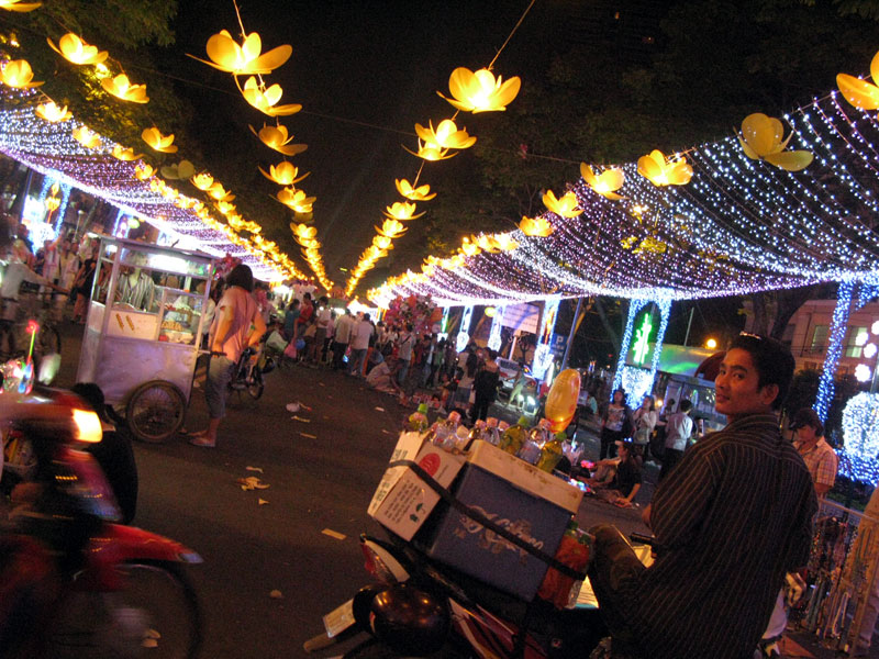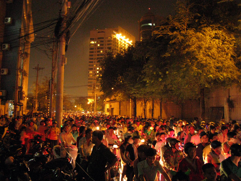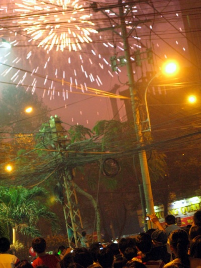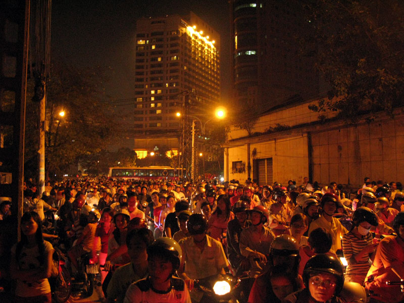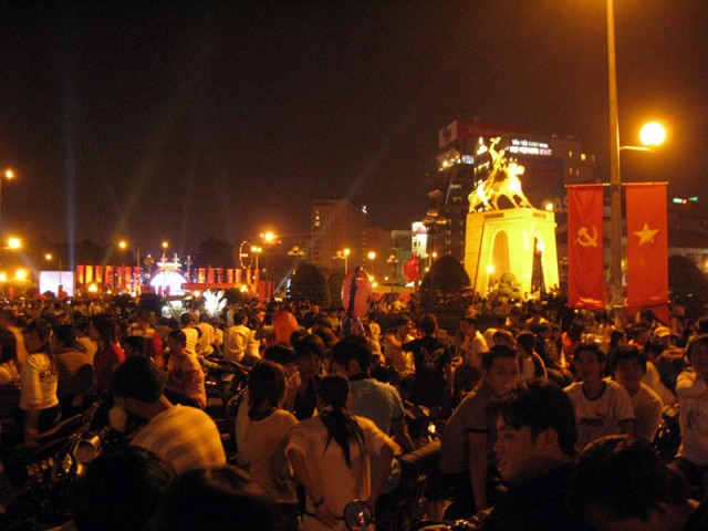 sector), отправились в гущу событий. Миновали сквер, где на сцене под прожекторами буйствовала какая-то попса, прошмыгнули между продавцами светящихся рогов и вареной кукурузы на красиво освещенной улице Le Loi и вписались в плотную толпу ожидающих Часа Быка. Вдруг народ заорал и над соседним зданием появилось зарево. Круто, фейерверк было нифига не видно из-за недоскребов. Мы ломанулись вслед за толпой вьетнамцев, очевидно знавших, где вид лучше. При этом было страшновато. Хоть вьетнамцы достаточно дисциплинированный народ, но толпа есть толпа – на ум сразу пришли случаи, когда в Индии, да даже и в России в давежке погибали люди. Короче, в таких случаях надо трезво оценивать ситуацию и иметь в виду ближайший закуток.