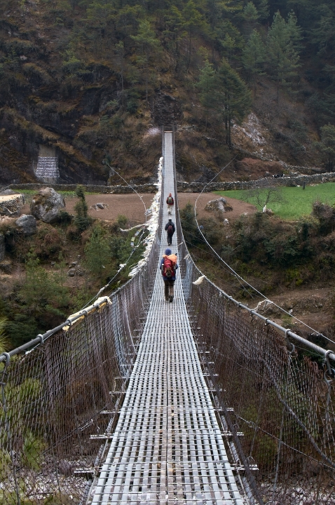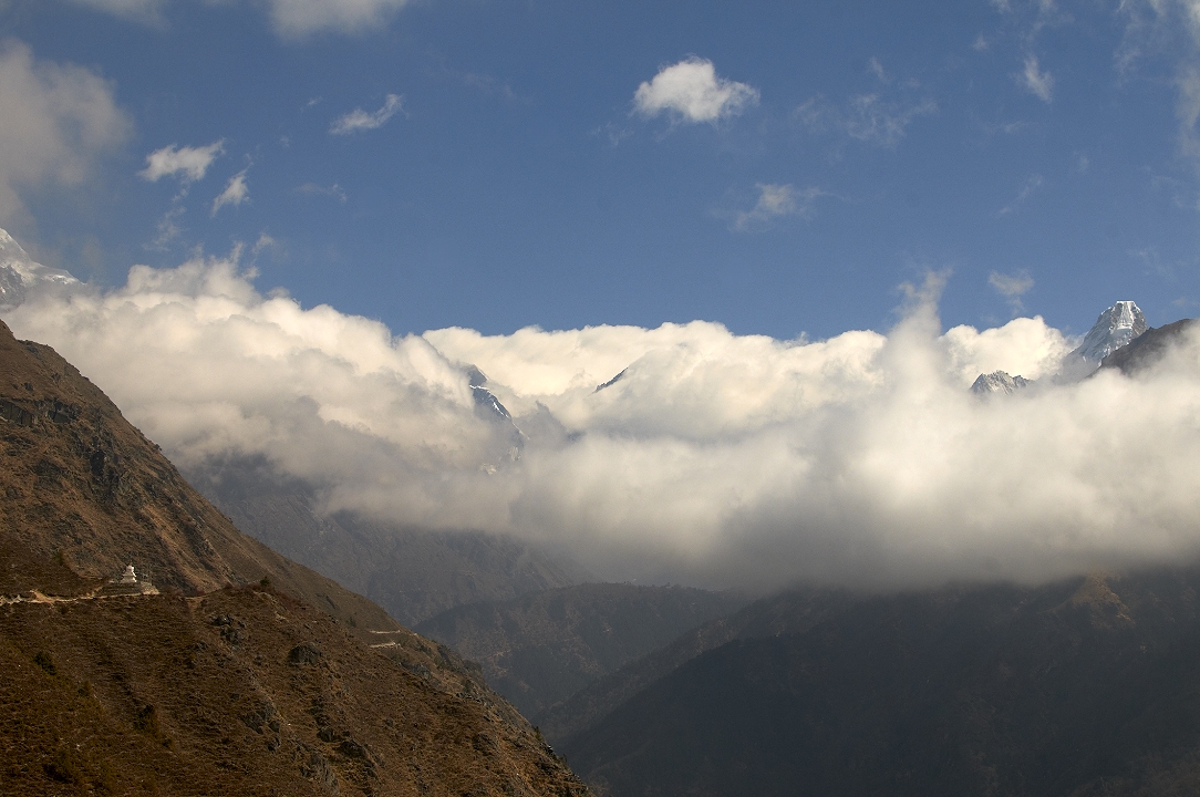 Пока сидим, случает землетрясение - 3-4 балла. Всего один толчок, но очень ощутимый. Над нами нависает огромный камень размером с автобус. Всю вторую половину дня идем в сплошном тумане. Останавливаемся в очень уютной гостинице Ama Dablam View Lodge в местечке Кьянгджума - последнем перед Намче Базаром.