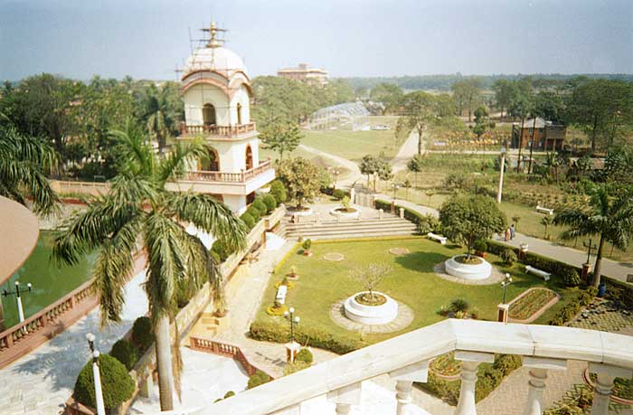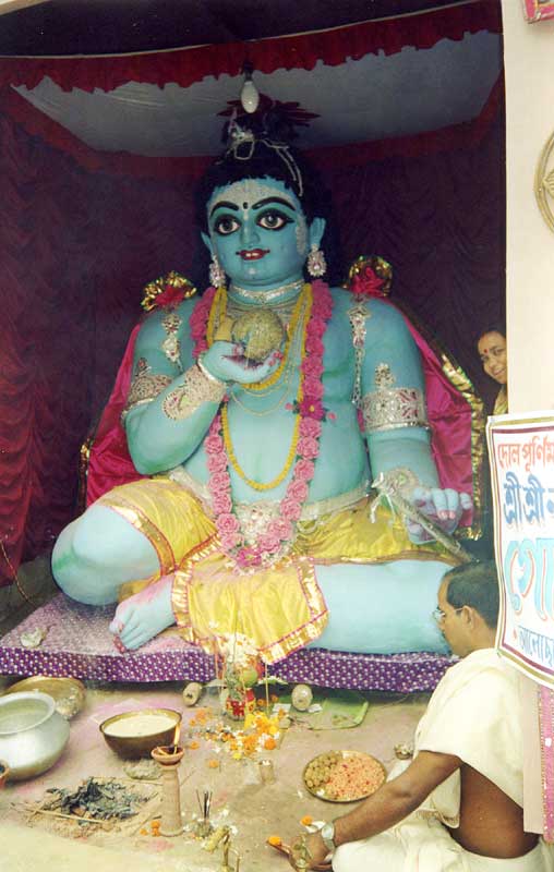 В Навадвипе еще есть храм, который местные называют Параматала или Поромотала. За правильность написания не ручаюсь, потому что видела самые разные варианты, - скорее всего, все пишут как хотят. Это маленький храм Шивы и Дурги. Примечателен он тем, что домики-алтарные, в одном из которых стоит Шива лингам, а в другом – Дурга, - они полностью обросли громадным деревом баньян. Остались только двери, в которые, собственно, входят люди, а все стены скрыты в корнях и стволах баньяна. На самом деле не понятно, - это одно дерево или несколько деревьев, потому что между этими корнями там располагается базар. В общем, там все переплетено этими висячими корнями, и создается впечатление, что этот баньян везде.