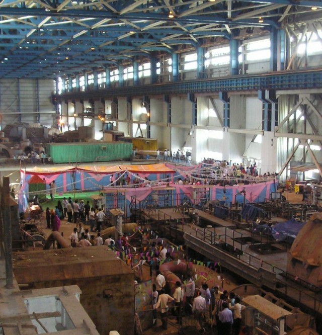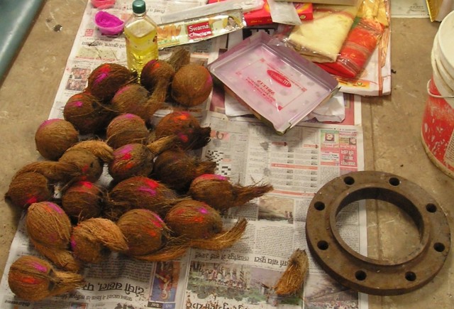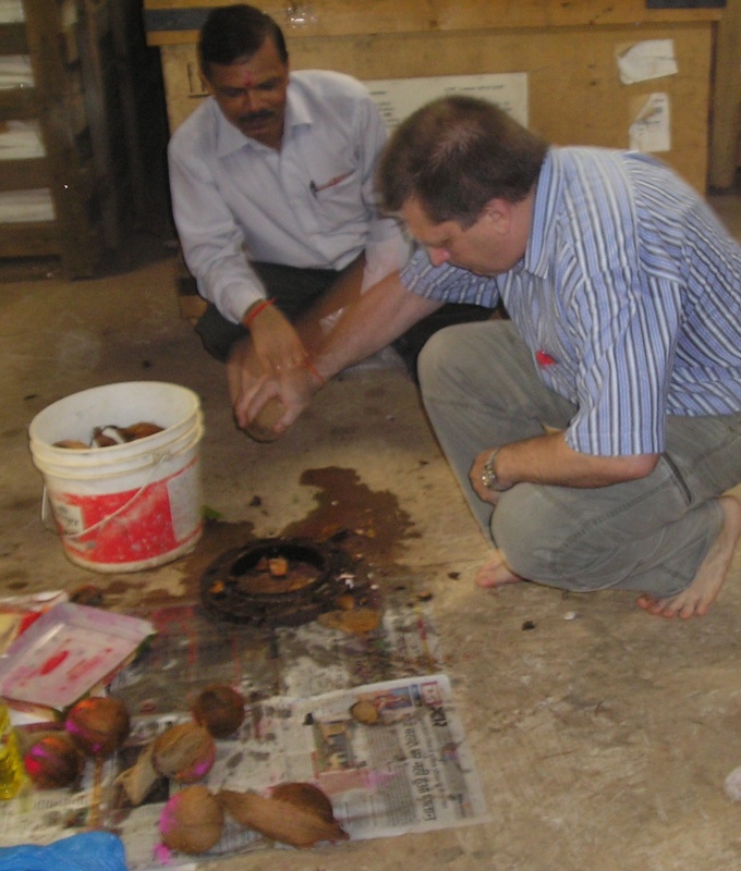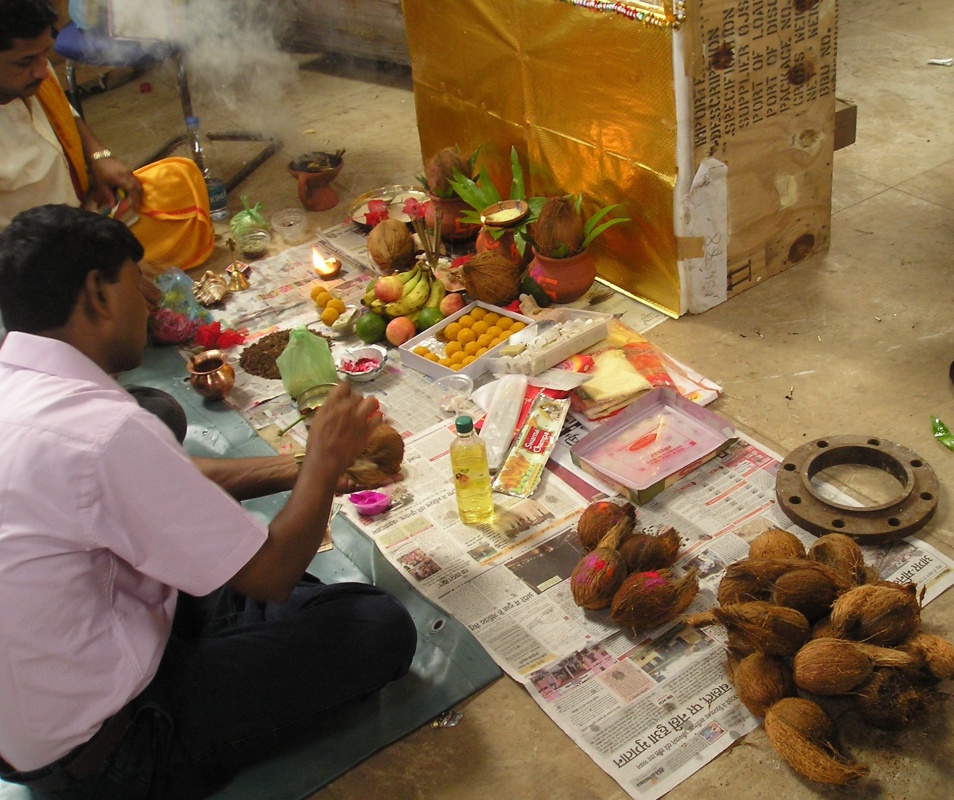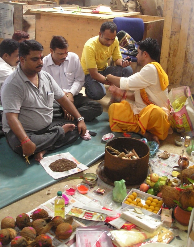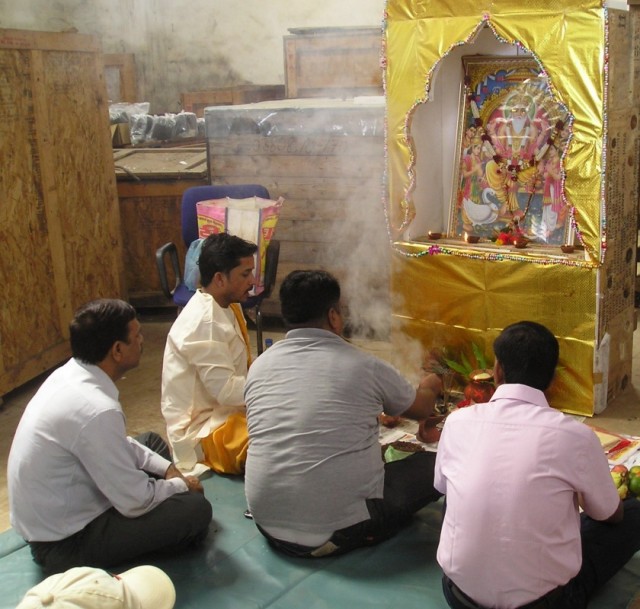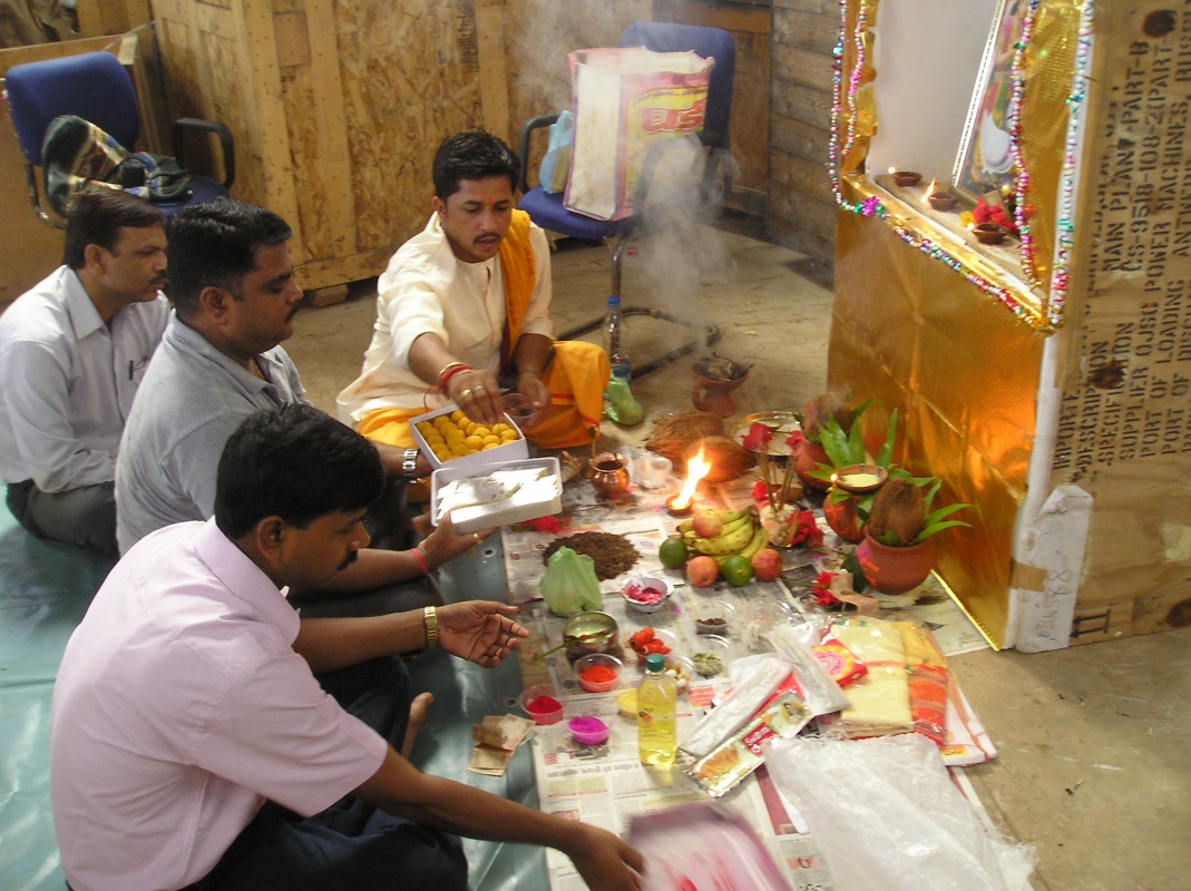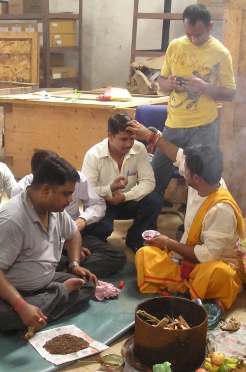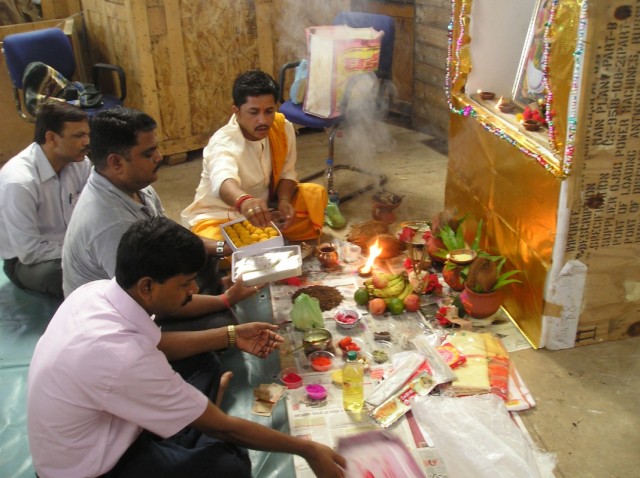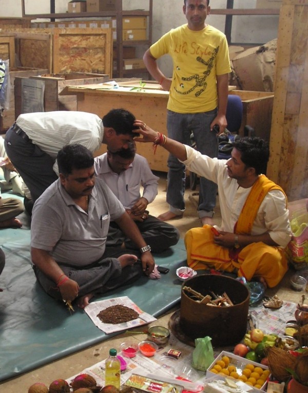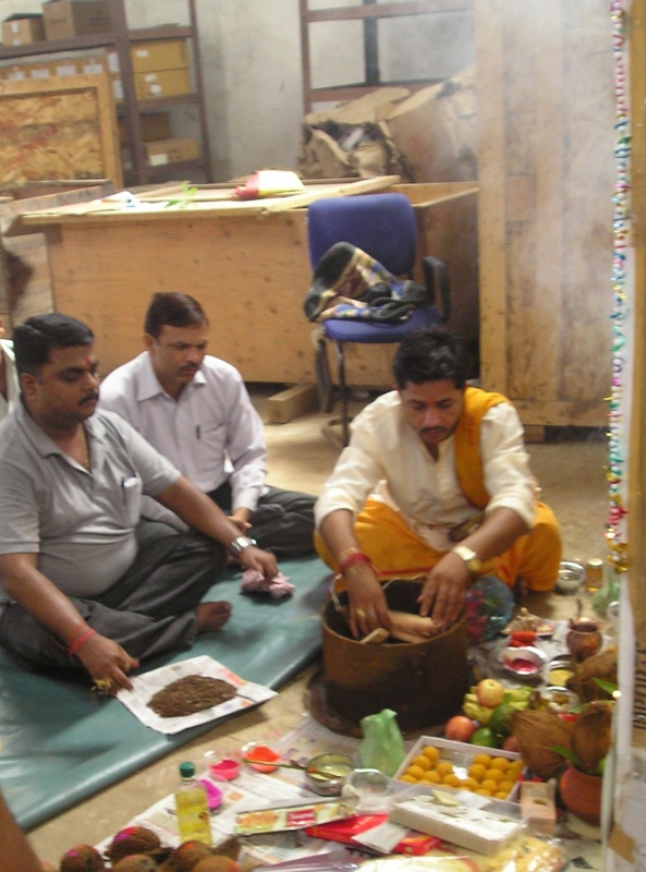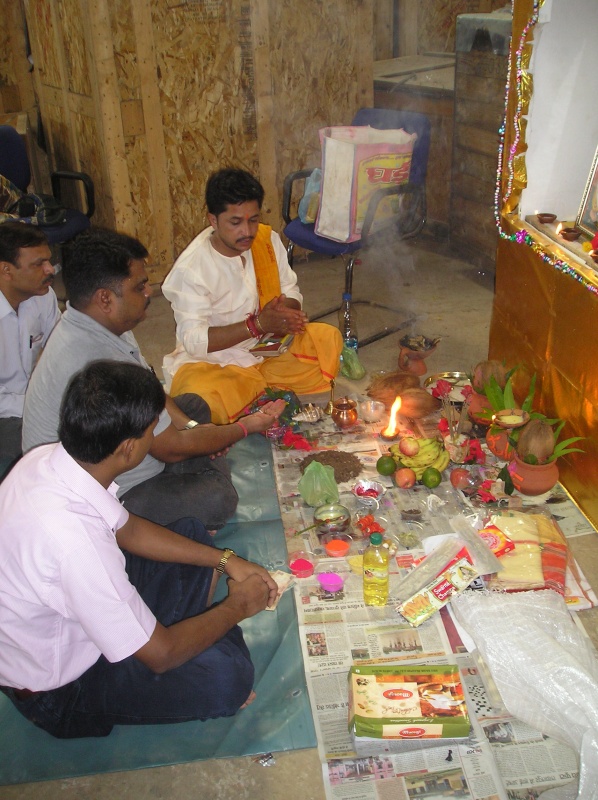 В субботу (у нас в Индии это полноценный рабочий день) с утра во всех трудовых коллективах началась пуджа. У нас она проходила в помещении склада, среди ящиков и бухт кабеля. Центральная часть склада была тщательно выметена и застелена