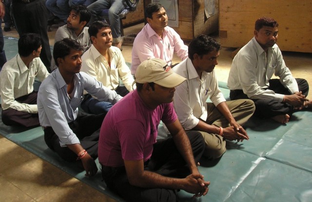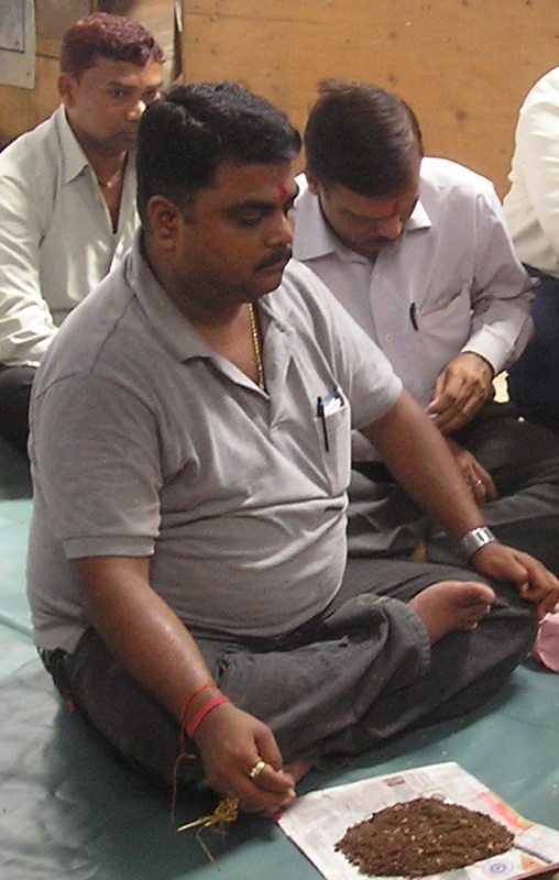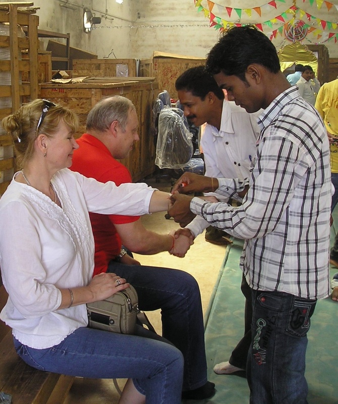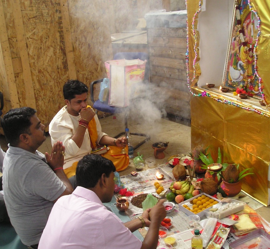 ковром укрывным материалом. Был сооружён из ящиков алтарь, куда помещено изображение Вишвакармана. Непосредственно перед алтарём расположились пандит и два его помощника, оба из касты браминов (наши завскладом и инженер по оборудованию). Далее сидели «по-турецки» рабочие склада, специалисты. Присутствующие русские сидели по сторонам на стульях. Зажгли огни, помещение наполнилось сладковатым дымом благовоний. Пандит завёл свой сакральный речитатив, время от времени прерываемый общим выдохом (я не разобрал, какое именно слово повторяли за священником присутствующие, но повторяли единодушно). Пандит ещё использовал ритуальную раковину, при дутье в которую получался звук резкий и громкий. Помощники пандита во время его молитвы (проповеди?) выполняли какие-то обряды – обносили образ Святого сладостями и фруктами, зажигали пучки травы. Потом установили перед алтарём жаровню со щепками и разожгли всамделишный костёр, опять же с использованием трав, щепоток ароматических веществ и капель каких-то жидкостей (в кувшинчик с жидкостью опускался пучок травы и капли попадали в огонь с его помощью). Церемония подошла к концу, пандит всем присутствующим нанёс на лоб тилак (единственной женщиной на церемонии была моя жена, священник не поставил ей тику, а только показал на баночку с краской и на лоб, мол, хелп ёселф, обслужи себя сама)). В дополнение на запястье всем повязали жёлто-красную нитку (когда нитку снимешь, нужно будет бросить её в реку) и обнесли прасадом, кусочками фруктов и сладостями.