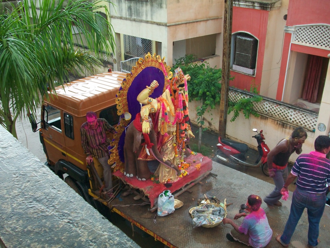 Теперь-то я знаю, что это Вишвакармана повезли на предание водам. А тогда решил, что народ готовится к празднованию Дурги заранее.
