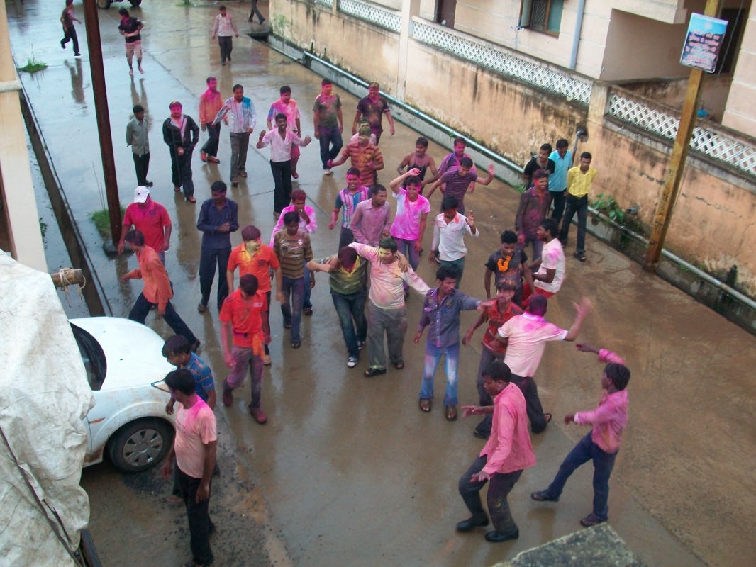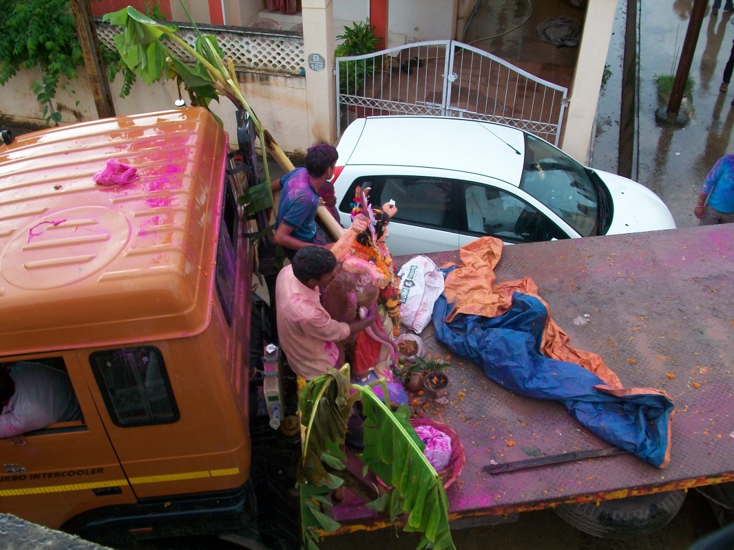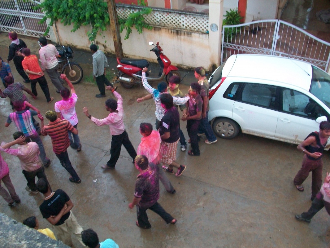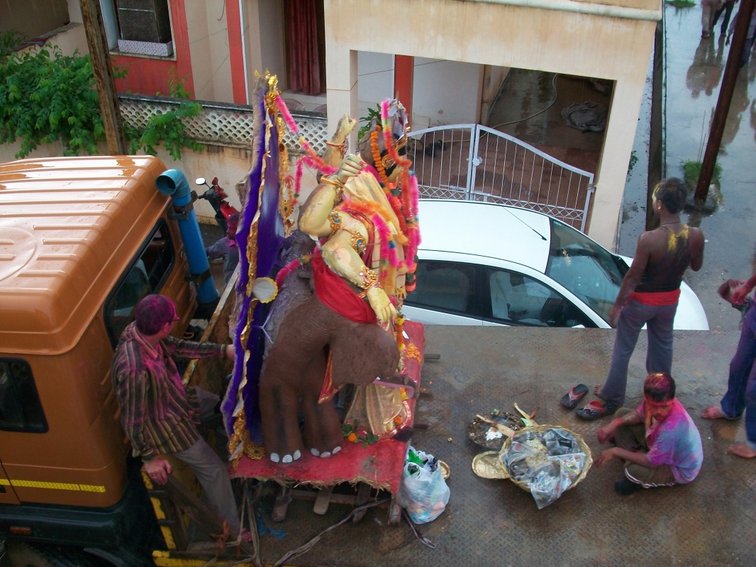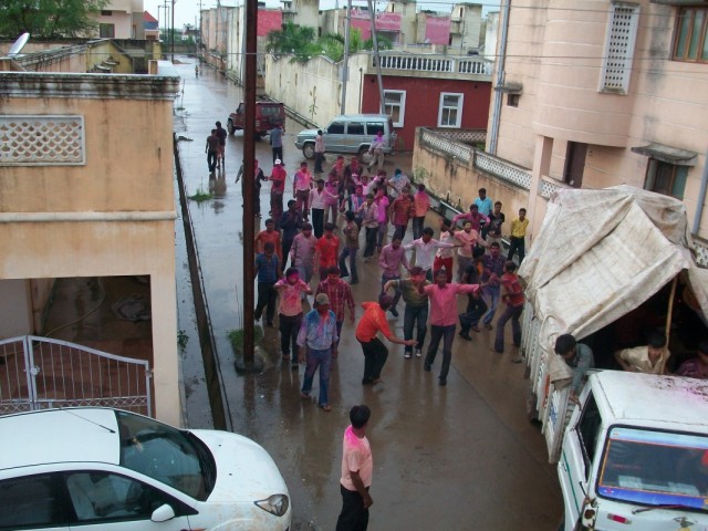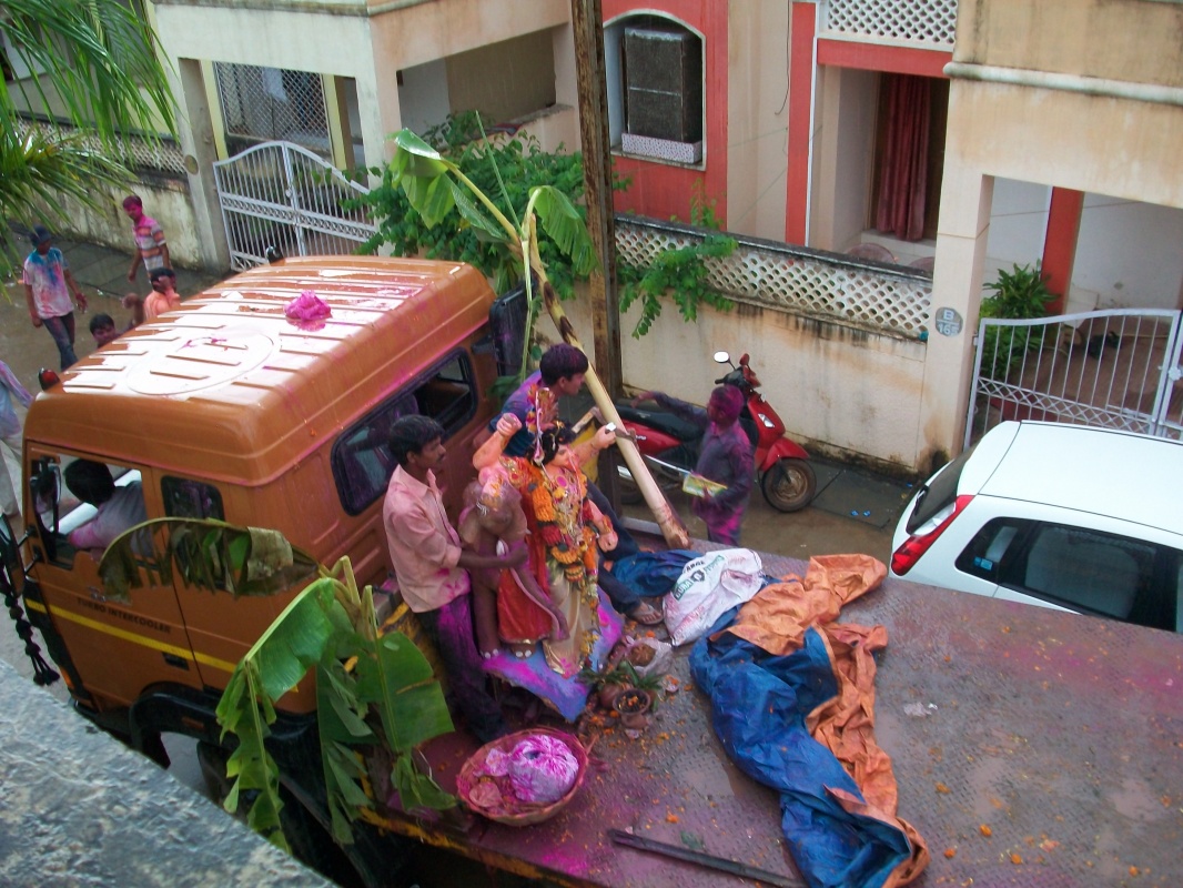 Грузовики медленно проехали по нашей улице, эскортируемые раскрашенными и (очень похоже) пьяными мужичками. Из рупоров на тук-туке оглушительно гремели индийские песнопения и какие-то речёвки, восторженно поддерживавшиеся и сопровождающей толпой, и высыпавшими на улицу жителями.