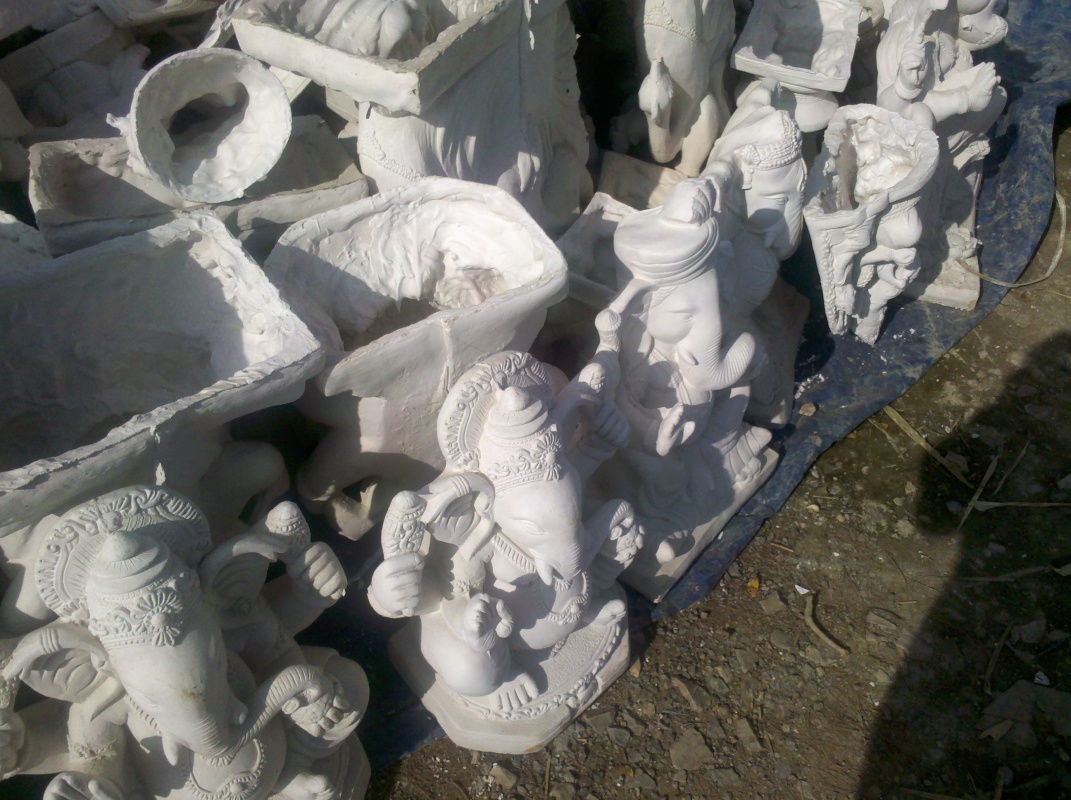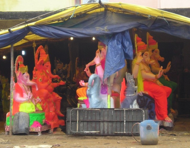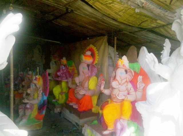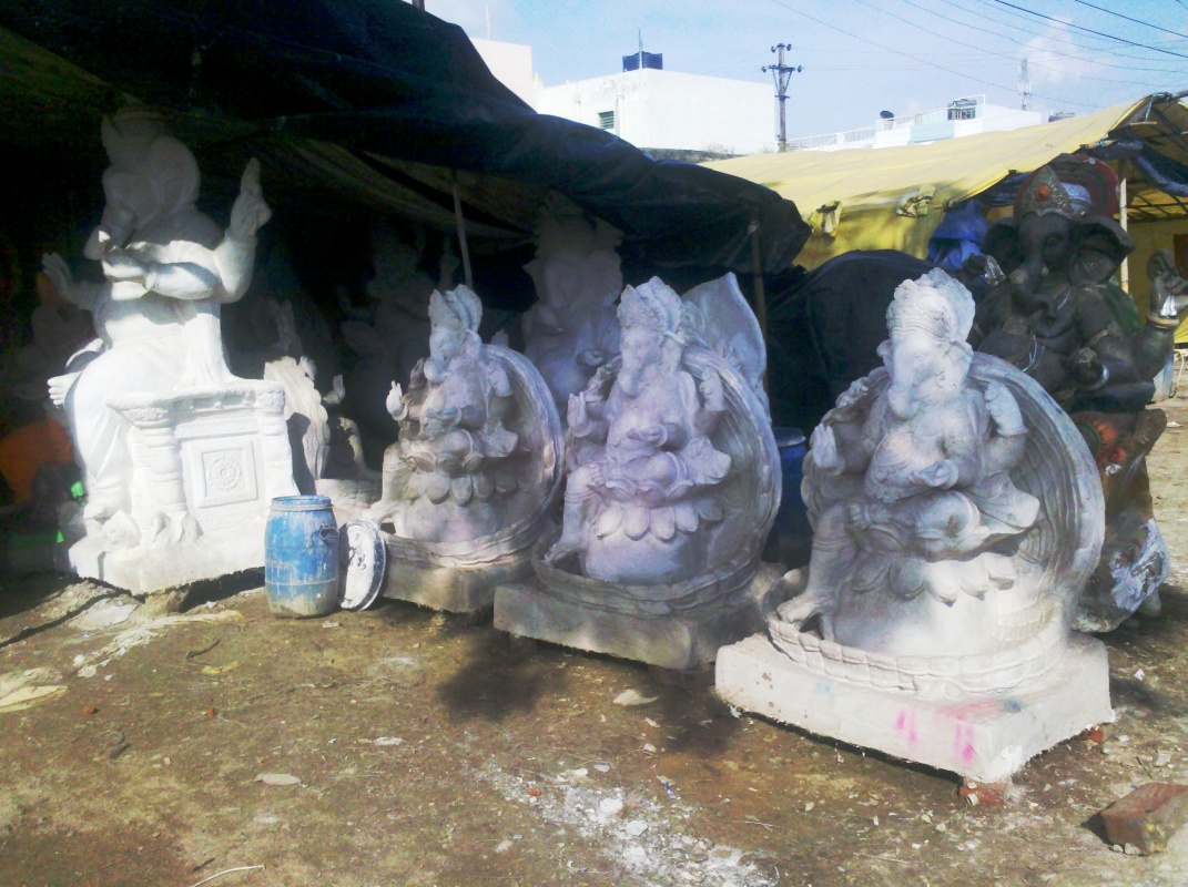 Народ индийский начинает готовиться к фестивалю Ганапати задолго до календарного срока. Палатки со сценами из жизни Ганеши ставятся на каждой улице Города (а иногда и на одной улице несколько). Фигурки Ганеши лепили раньше из глины, а сейчас делают из гипса, вопреки обращениям защитников окружающей среды. Гипс растворяется в воде медленно и не окончательно, загрязняя озёра и реки. Но гипс, при этом, намного технологичней, поэтому многочисленные скульптурные мастерские продолжают производственный процесс, охватывая гипсовым искусством всех желающих. Местные жители говорят, что в качестве скульпторов подвизаются индийские цыгане.