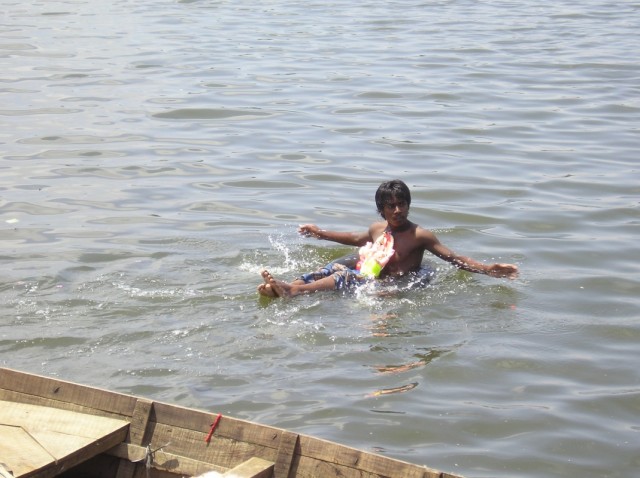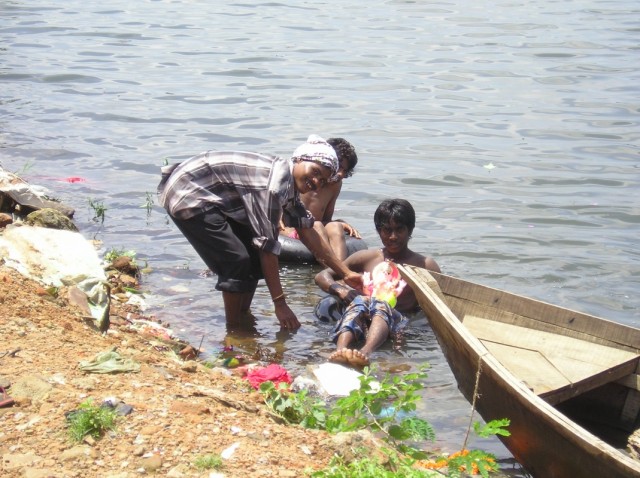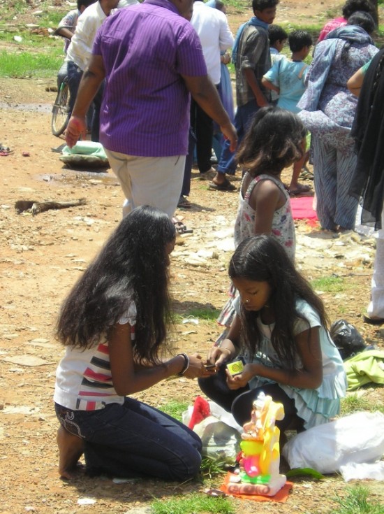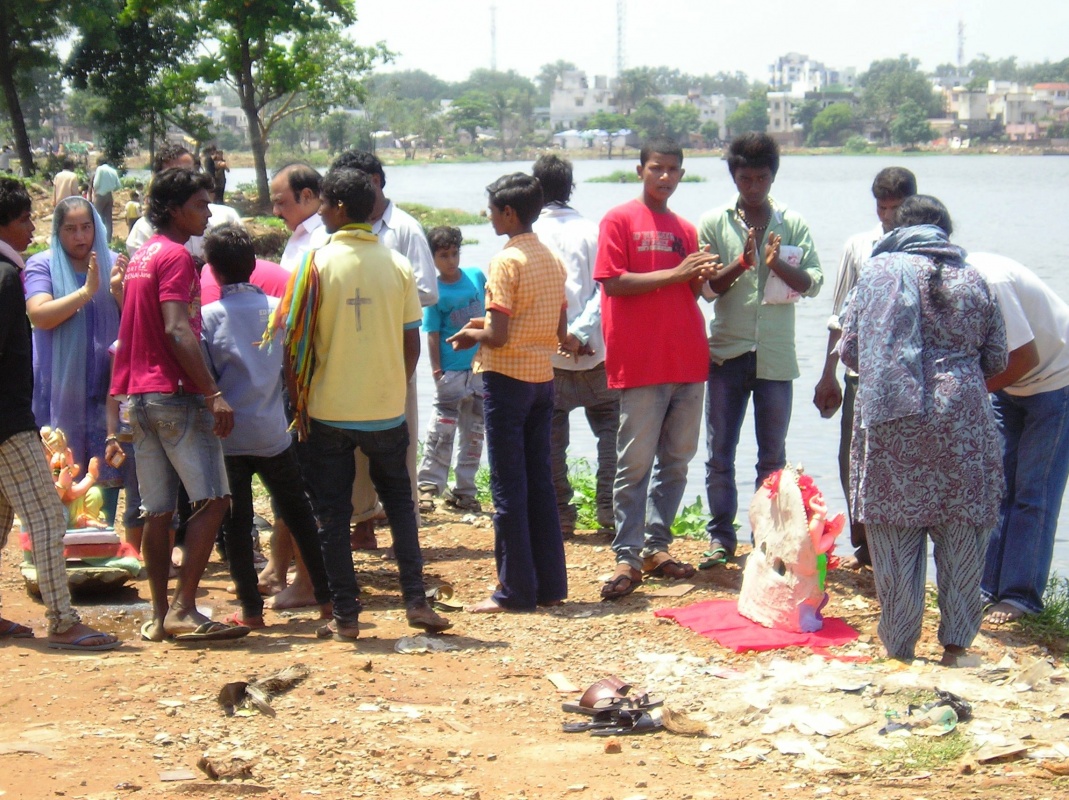 Воскресным днём в Райпуре я стал свидетелем древнего обряда погружения изображений Ганеши в воду местного озера. Обычно крупные статуи божества (до нескольких метров ростом) погружают вечером, при большом скоплении верующих, под бравурную музыку и крики толпы. Днём праздник проходит тихо, по-семейному, родители с детьми приносят на берег любовно украшенные небольшие фигурки Ганеши, прощаются с ними, поют гимны, зажигают ароматические палочки и, в конце концов, отправляют своего Ганешика в последнее плавание.