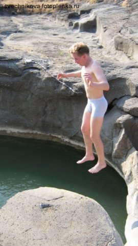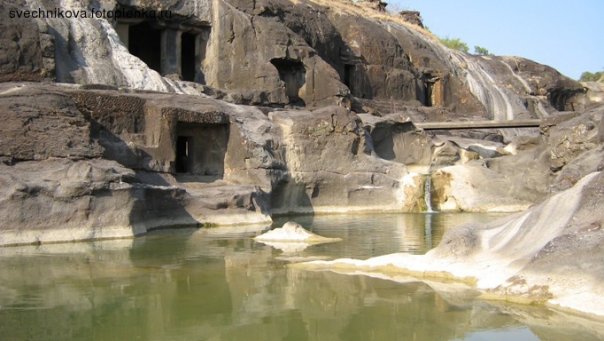 В Эллоре я тоже была покорена этими маленькими пещерками Ганеши и другими наверху, водопадами и озерцами. Наш провожатый заверил нас, что купаться можно и мы плавали в ледяной воде маленького горного озерца - это было ТАКОЕ блаженство после нескольких часов жары! Мой спутник вообще туда прыгнул с камня (я поймала на фото)