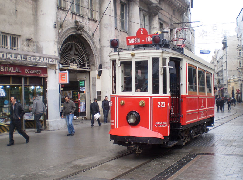 На бульваре Истикляль, кроме всего прочего, нас поджидает ретро-трамвай. Выглядит это средство передвижения вполне старинным, хотя линия открылась 29 декабря 1990 года. Линия ретро-трамвая, длиной 1,6 км, идет по всему бульвару до площади Таксим. Проезд стоит как и в любом общественном транспорте - можно использовать IstanbulKart или жетон.