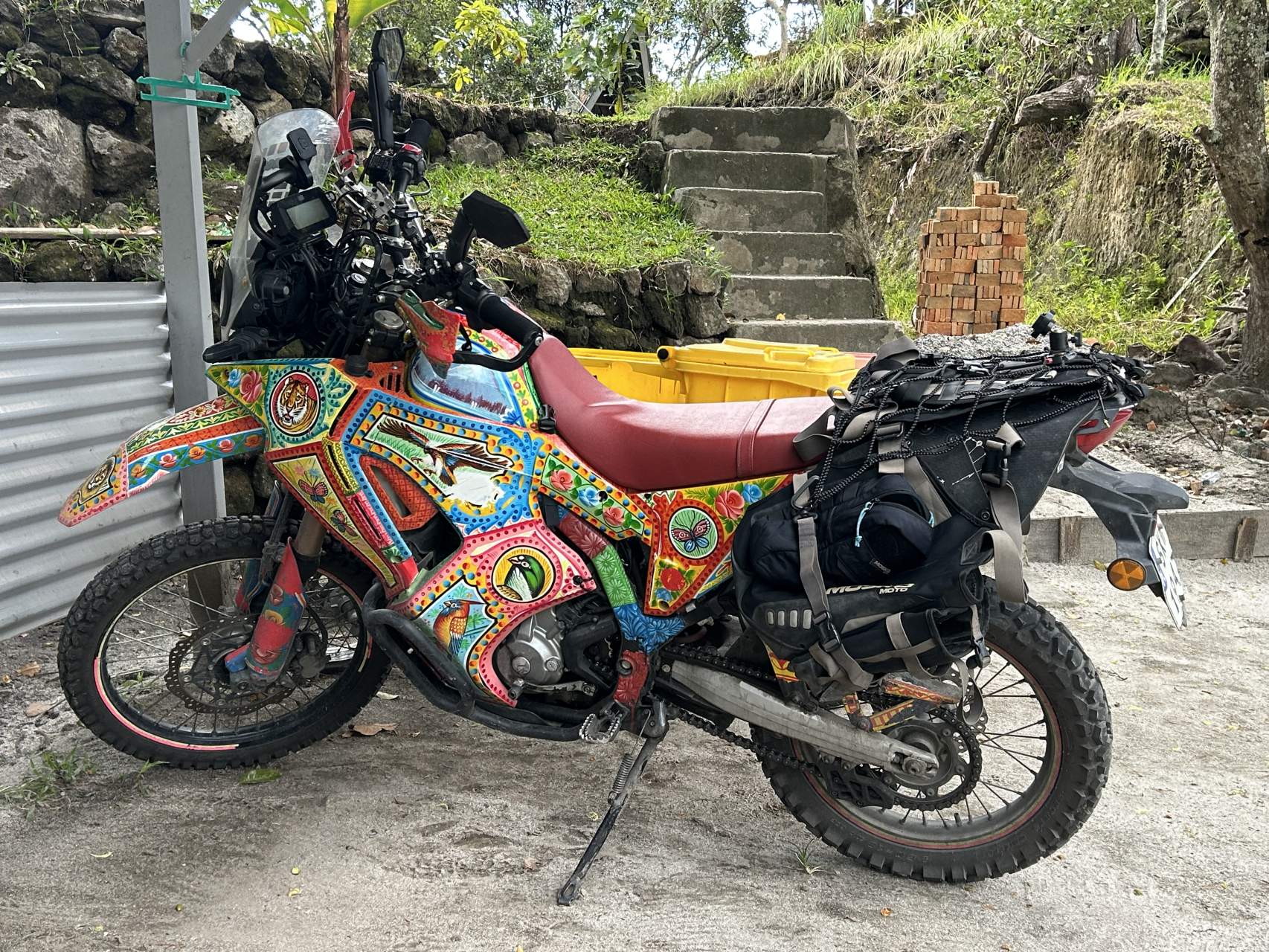 На Самосире встречаешь неожиданных персонажей. Вот, например, путешественница из Польши (плюс ее друг на другом байке), приехала на пепелаце с польскими номерами. Уже три года в пути в кругосветке. Ее моц не просто техника, а движущаяся икона кочевого искусства: расписанный в стиле, больше похожем на индийский трак-арт, чем на привычный байк. Тигр, птицы, орнаменты, цвета. Настоящий межгалактический дирижабль для дальних странствий.