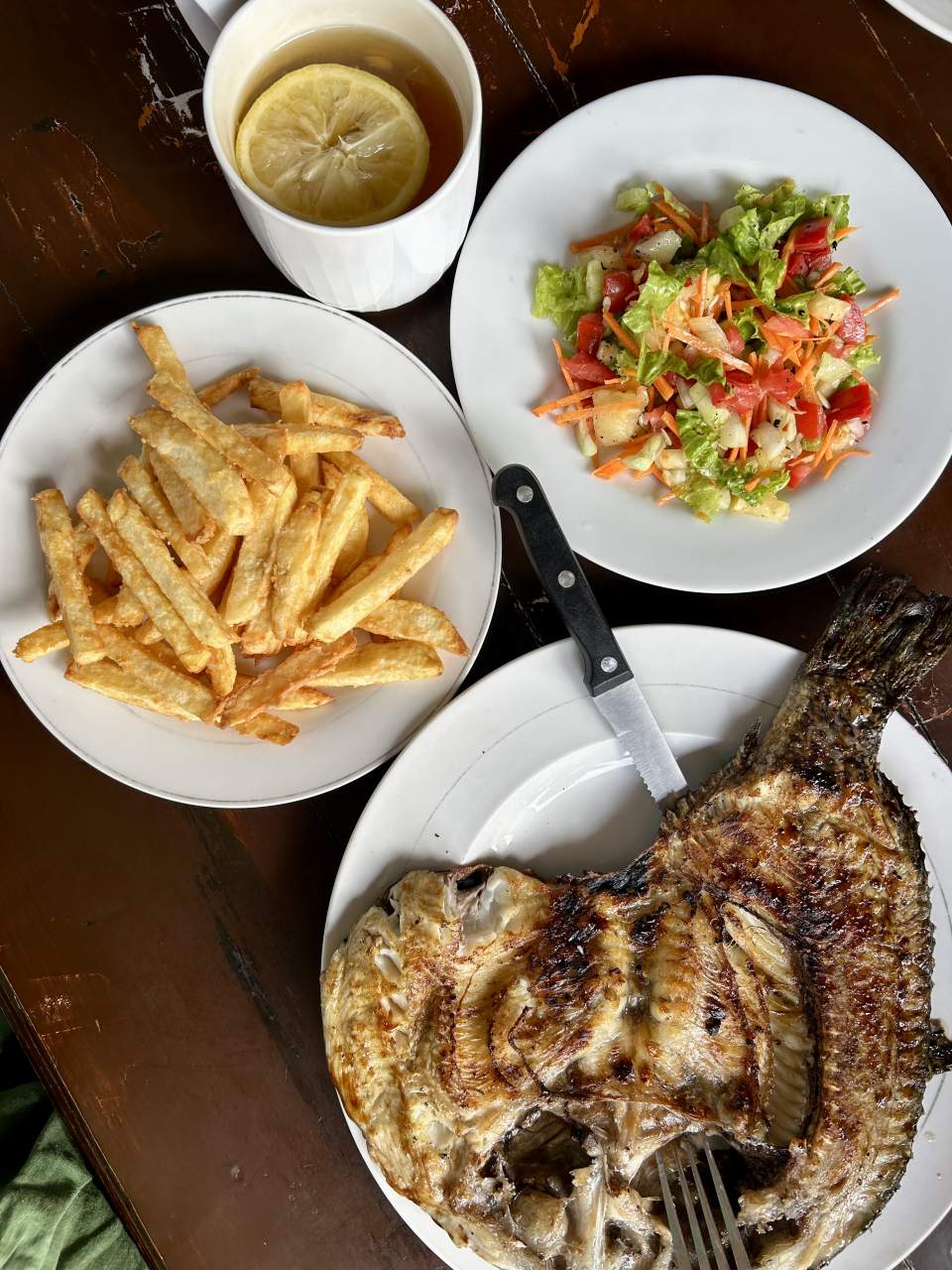 На первом фото сама Дженни готовит карпов, а на втором фото порция из трех блюд на 390 руб (80к) - целый карп, фри из свежего картофеля, и овощной салат с ананасами. Вместо чипсов могут сделать настоящее пюре. Их голландцы научили как надо, привычный нам вариант, а не как в Индии клейстер.