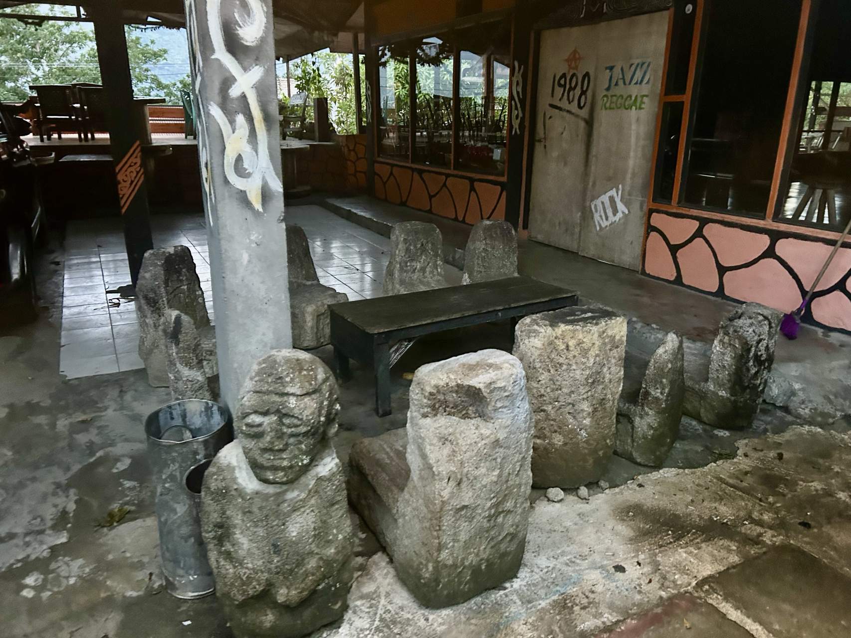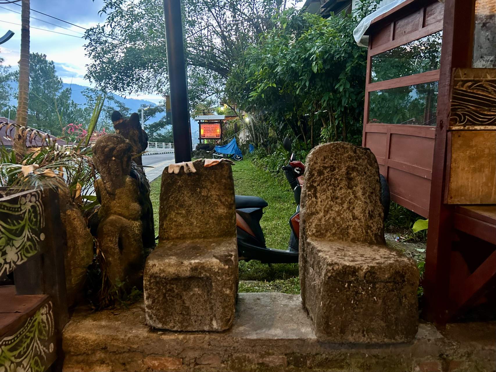 На острове можно встретить древние артефакты в самых неожиданных местах. В пабе в Тук-Туке посадочные места на террасе - stone chairs (фото 1-2). Это мегалитические комплексы, на которых заседали вожди батаков, решали споры, выносили приговоры, проводили ритуальные суды и казни.