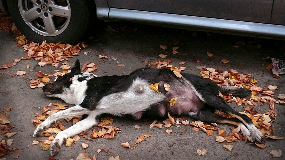 В 20 метрах от этого места (ул. Ю. Коцюбинского) - в парке гуляют дети, а в момент когда я подошла заснять это, большая черная машина хотела припарковаться прямо на тело. Я не могу спокойно жить в городе, где по ночам слышен душераздирающий визг собак, их все еще ловят, все еще травят, они умирают в судорогах и муках.