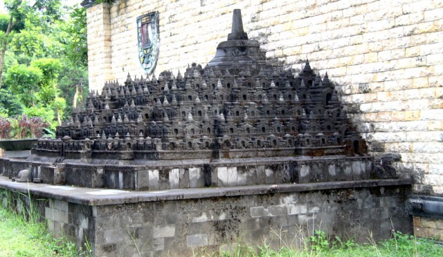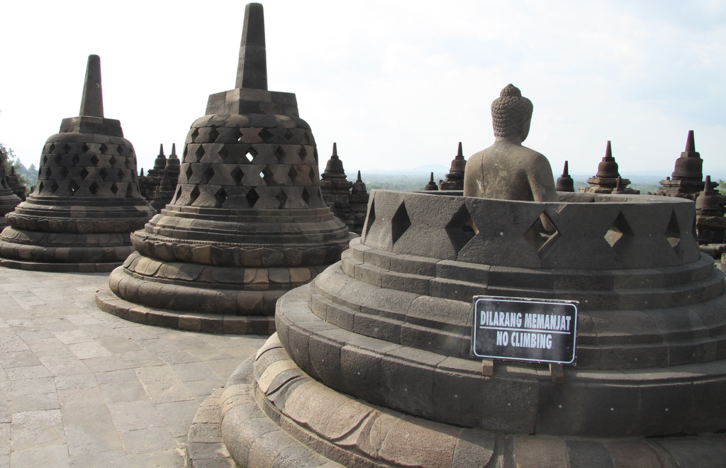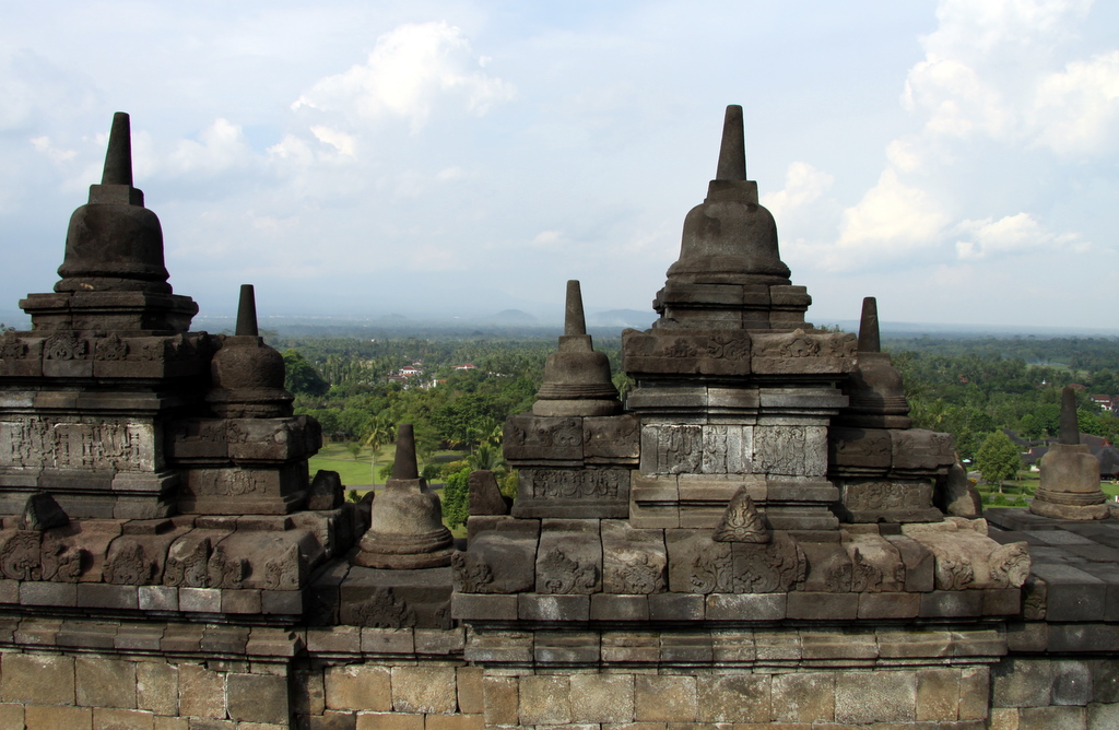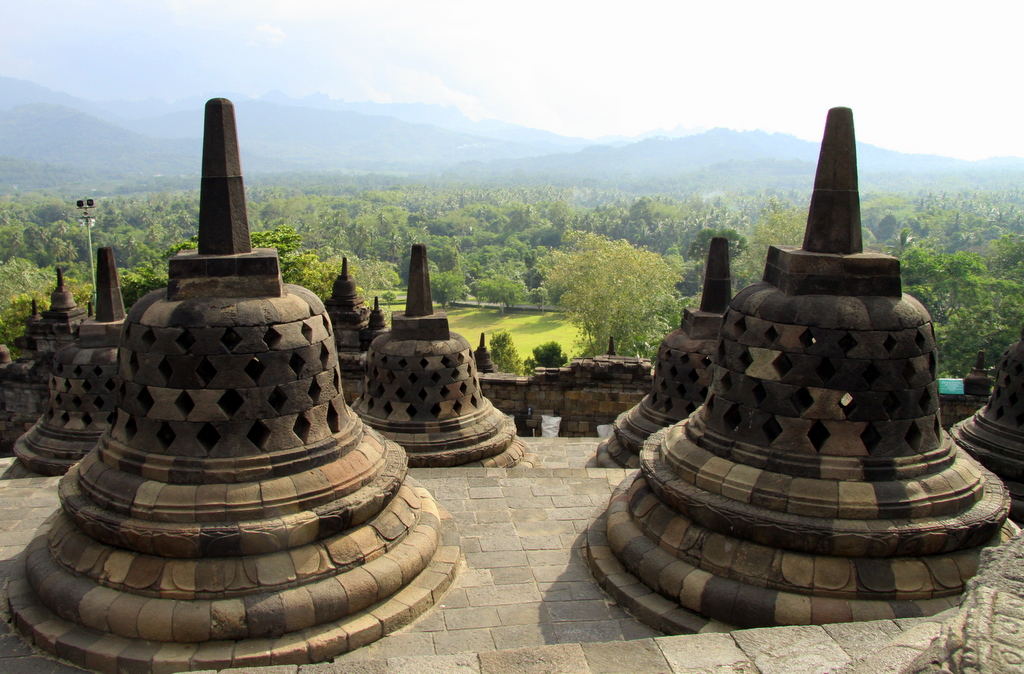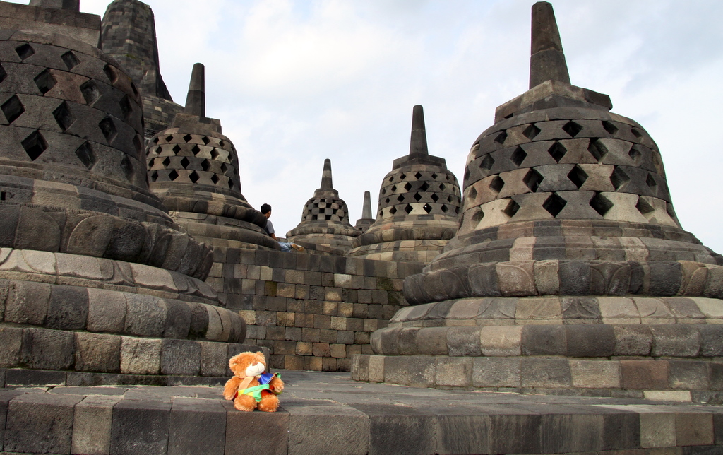 Боробудур называют каменной энциклопедией буддизма. Внушительная энциклопия из 55 тысяч куб.метров камня. Своими очертаниями Боробудур напоминает мандалу - олицетворяющую у буддистов Вселенную. Внизу 5 квадратных террас символизируют мир Земли, а 3 круглые повыше - мир Неба. На самом верху святилище - нирвана, т.е. абсолютная духовная свобода. Если перевести Боробудур, то значит -"много Будд". Ну их там достаточно и в рельефе и в скульптурах - штук 500. Многие из них сидят в ступах, ну и конечно народ насочинял всяких поверий, что если дотянуться до этого Будды, то исполнятся все желания.