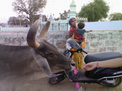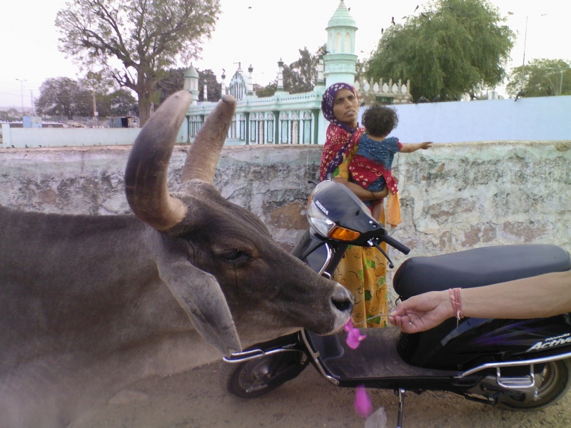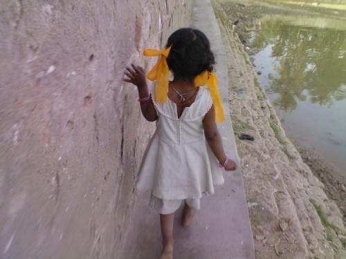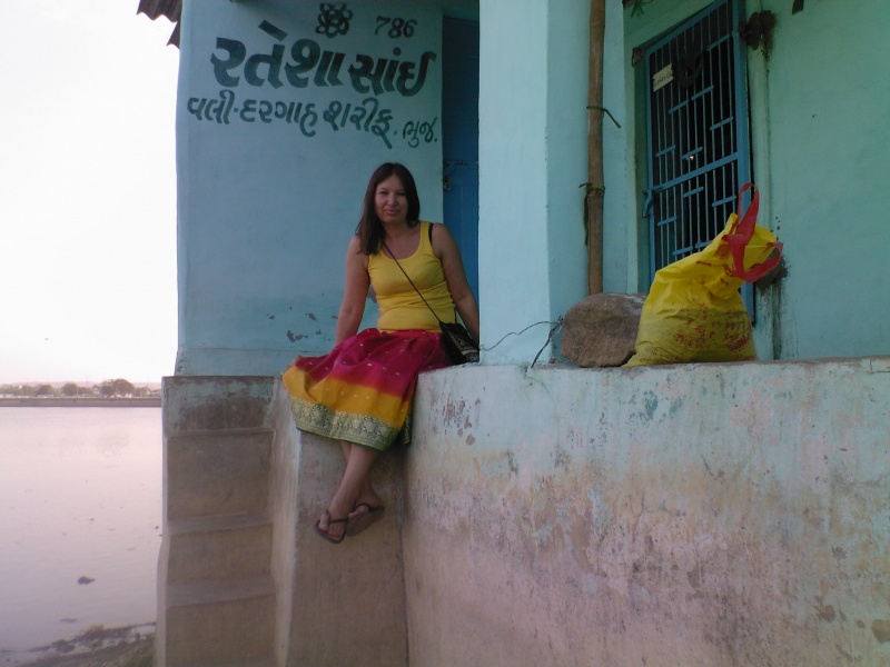 Но конечно ,самое интересное-это архитектура Бхуджа.Архитектура Бхуджа,а вернее роспись домов,очень отличается от других городов Индии.Это не яркая вакханалия и буйство красок как например в Джайпуре,а тонкие,пастельные цвета,просто какой то "карамельный город".Какое то время мы идем у воды,а потом на пути вырастают дома и надо выходить на дорогу.Гуляя между домов мы замечаем маленькую бетонную дорожку,которая ведет к озеру,мы сворачиваем ..а через некоторое время дорожка зависает над озером,причем она такая узкая,что два человека не разойдутся.(для этого есть маленькая площадка ,такая крохотная,как раз поставить ноги и переждать "встречный")с одной стороны-стена,с другой обрыв .а внизу озеро.А в конце дорожки-маленькая мусульманская святыня(очередное надгробие на нашем пути) и все..дальше обрыв..Через пять минут мы услышали голоса и из-за поворота показались две женщины с ребенком.Они открыли дверку,зажгли благовония,прошептали молитвы и несколько раз обошли надгробие и бросили монетку в специальный ящичек(а я в это время уже напросилась тихонечко посидеть в уголочке)Совершив свой тайный обряд ,они по тропинки пошли назад,ну и мы с ними,а на крохотной площадке ужу стоял"встречный"-бабушка(на дорожке нам с ней не разминуться..)