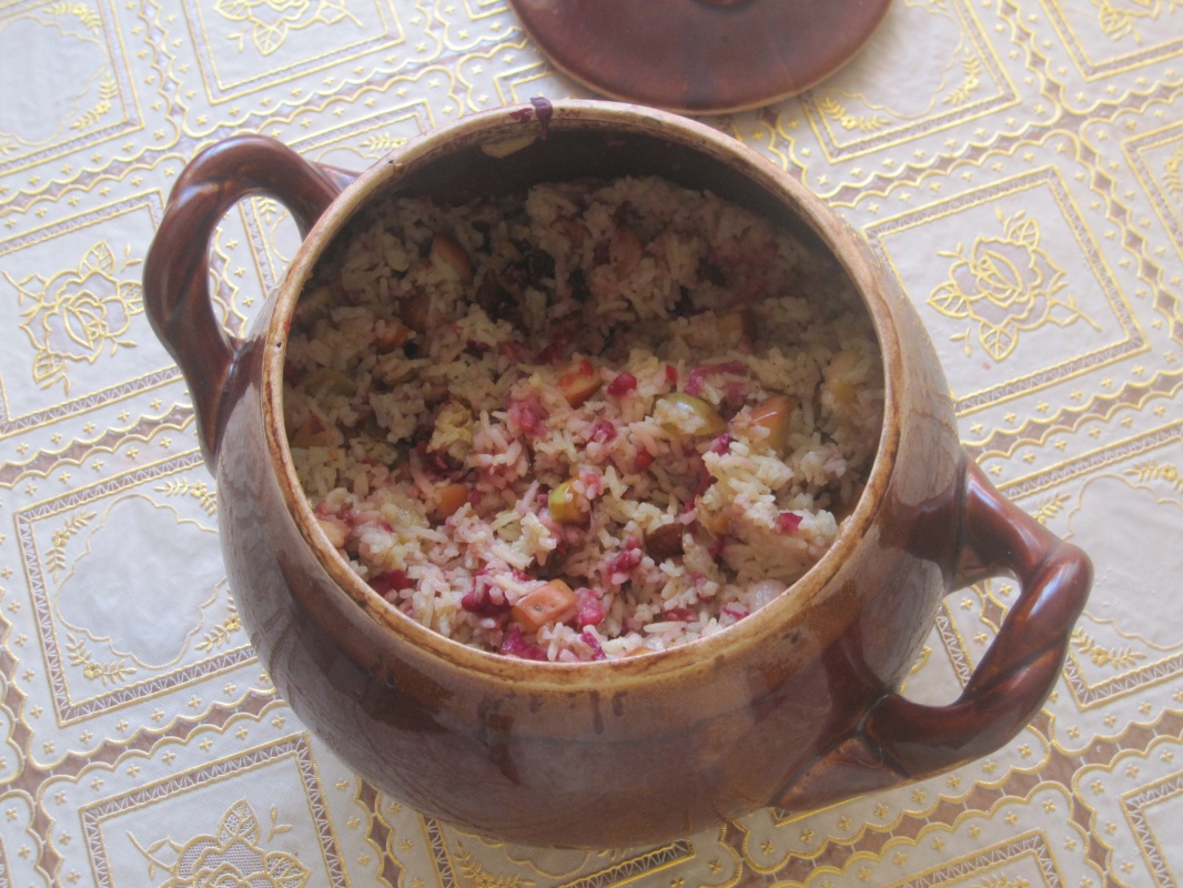 Готовку лучше проводить в казане или толстостенной кастрюле. Но есть и другие варианты. Я, например, обжарил специи на сковороде, добавил туда рис, пара минут готовки и все это перекочевывает в большой керамический горшок. Добавляем молоко, воду, все это на 1-1,5 пальца перекрывает рис и ставим в разогретую духовку минут на 40. Тем временем обжариваем орехи и под конец обжарки можно вбросить фрукты плотной консистенции типа яблок, чтобы они пропитались горячим маслом и чуть притомились. После томления блюда в духовке открываем крышку, убеждаемся что рис рассыпчат и готов, вся влага впиталась/испарилась, добавляем орехи, фрукты, розовые лепестки и аккуратно и тщательно перемешиваем. Ставим в уже выключенную духовку минут на пять для дозревания или, если готовим в кастрюле, накрываем чем-то энергосберегающим, полотенцами например. В эти пять минут еще несколько советов. Совсем не нужно быть пунктуальным в предлагаемых пропорциях, если вы увеличите дозу фруктов и орехов, то только порадуете свое гастрономическое восприятие. Орехи вовсе не надо обсушивать после жарки, если не злоупотреблять маслом его излишки впитаются и сделают плов не таким сухим.