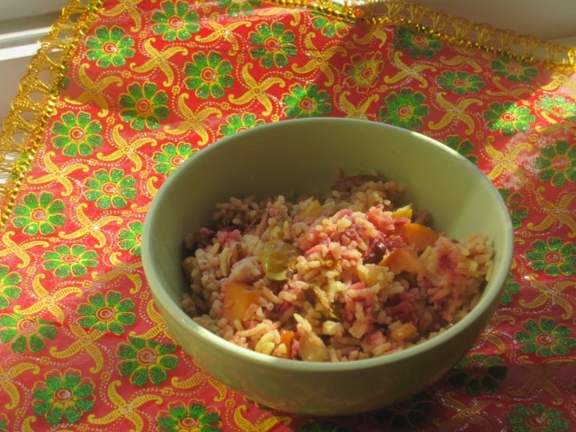 Итак, приступим. Рис, вне всякого сомнения длиннозерный, лучше замочить за несколько часов и не забыть основательно промыть и откинуть заблаговременно на дуршлаг или сито, чтобы дать стечь воде. В разных рецептах молоко, сливки и вода присутствуют в разных пропорциях, можно в принципе отказаться от сливок, но увеличить количество масла, чтобы не получить плов сухим. Фрукты могут быть любыми – то, что найдется в саду-огороде или недавно принесено из магазина. Можно добавлять ягоды(удачным оказался опыт с малиной), можно использовать сухофрукты, консервированные и из домашних компотов. Орехи – без комментариев, 1-2 вида вполне достаточно. Сахар лучше заменить медом, добавить его прямо в тарелку или разогреть в микроволновке с фруктами. Топленое масло может быть не только не топленым, но и быть частично замененным растительным или птичьим жиром. Специи – основной камень преткновения. Например, где найти эти нити шафрана, да и кардамон и розовую воду нечасто у нас встретишь.То, чего нет в наличии пропускаем или заменяем чем-то подобным. Вместо шафрана – куркума, тоже придает красивый желтый цвет рису (кстати, ушлые русские фасовщики так и умудрились куркуму обозвать – индийский шафран, а в качестве картинки сняли клубни, больше похожие на имбирь), розовая вода с успехом заменяется красивыми темно-красными лепестками роз, порезанными на узенькие полоски, ну а вместо остальных недостающих можно добавить что-то колоритное восточное и/или добрую щепоть привезенной из Индии смеси – для бирьяни, карри, масала