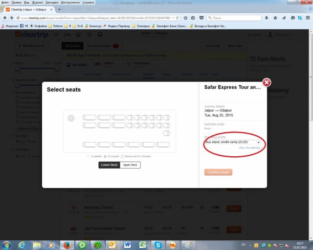 Выбрала место - нажимаю "Book" и появляется время отправления 23.25