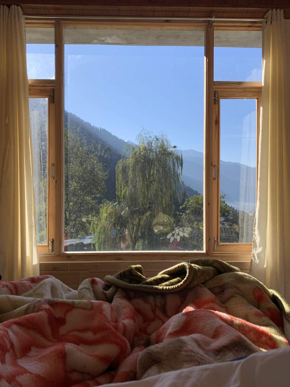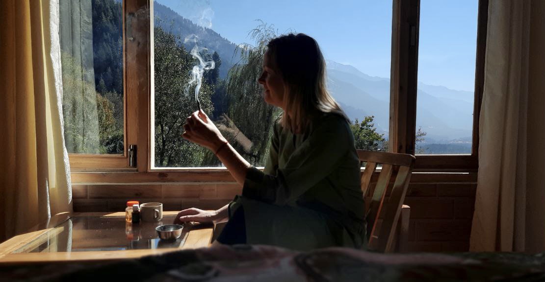 Вот уже месяц в дома. Кто бы мог подумать , что самое тихое и спокойное место, найдется на склоне одной из самых туристических деревень на севере Индии? Наверное никогда я не жила с панорамными окнами на две стороны. Я всегда была жадна до мест и часто хотелось пожить то там, то сям. К счастью, жизнь сложилась так, что даже в рамках моего крошечного бюджета у меня всегда есть выбор. Вот ты любуешься на зеленоватую морскую воду и шикаешь на макак, заглядывающих тебе в окно, вот щуришься на утренние гималайские предгорья. Вдыхаешь воздух сада и мунсунного дождя в непальском дворике или смотришь на пробивающуюся зеленую листву из спальни в доме друзей в далекой России. На днях проглядывала отрывки выступления знакомого дизайнера, где он, на вопрос из аудитории о его подходе, ответил, что убирает из интерьера все лишнее, без чего не становится хуже. И я подумала , что это можно применить практически к чему угодно). Часто, те вещи, за которые мы так цепляемся, оказываются не такими уж необходимыми для нашего благополучия и избавившись от них, понимаем, что они как гири тянули нас вниз.