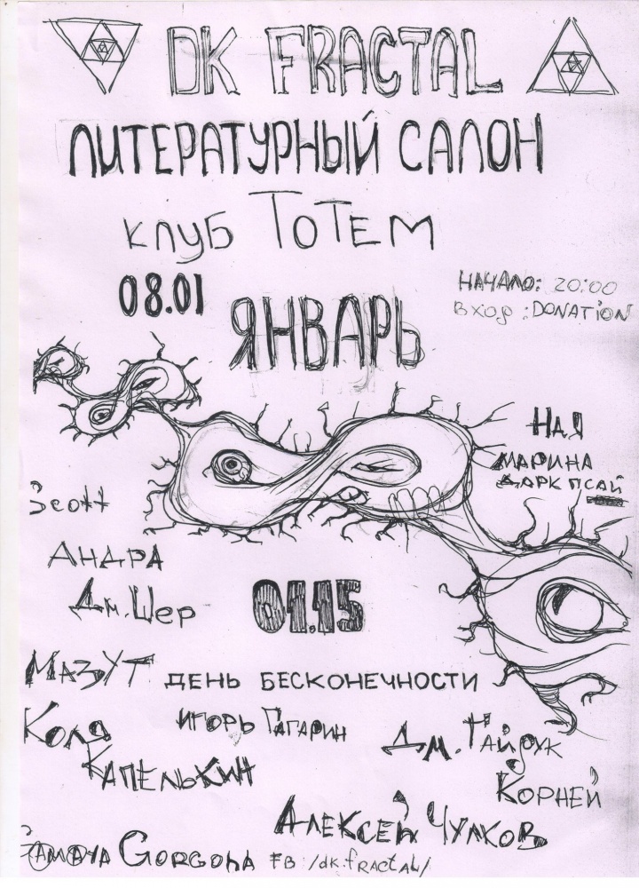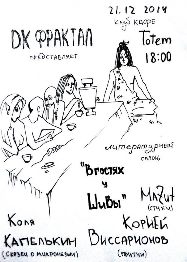 Друзья! Буду 8-го января в 8 вечера выступать восьмым по-счету с восемью рассказами на литературной вечеринке в арамбольском «Тотеме».