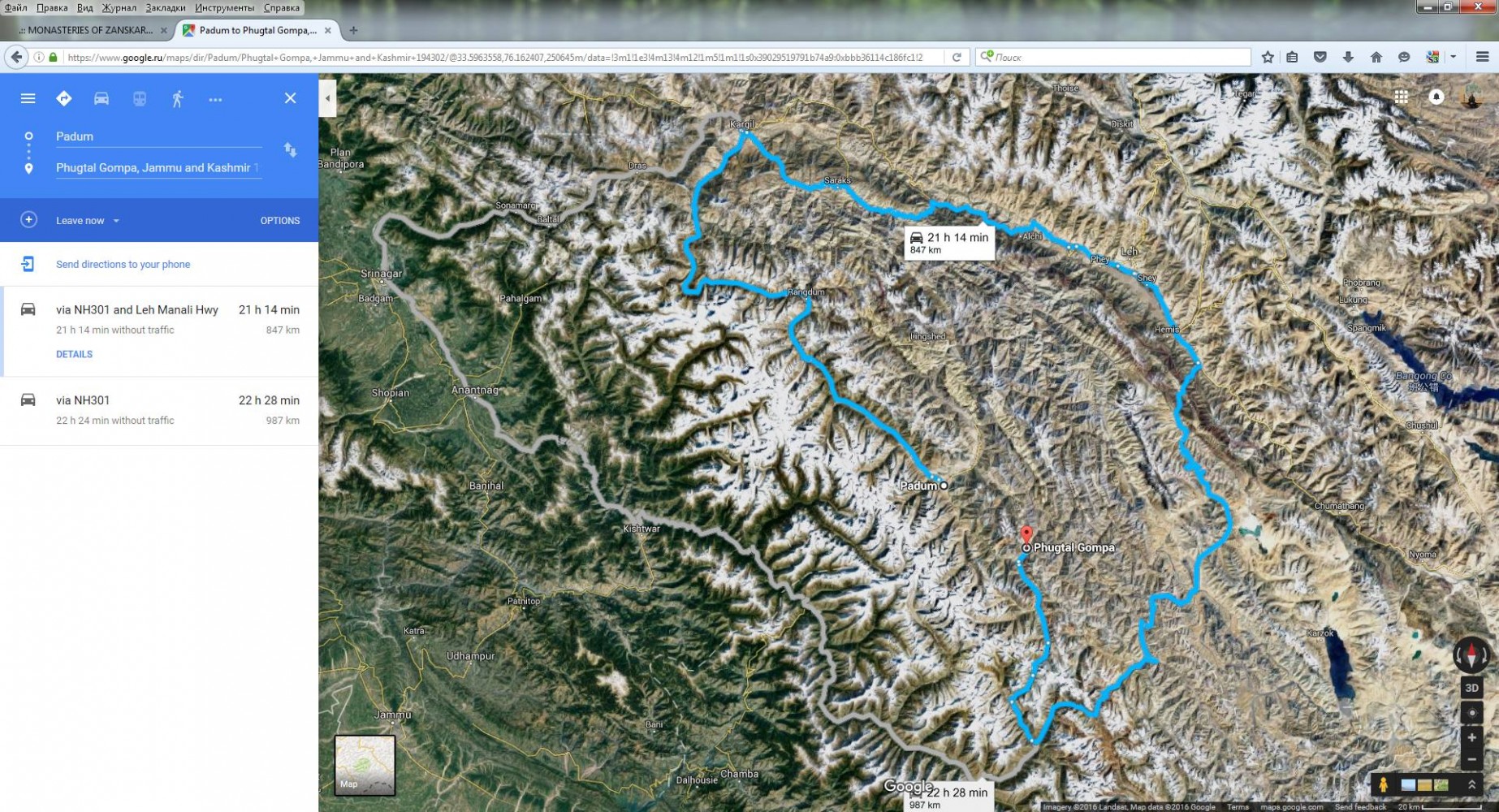 Вот что интересно: если Гугла спросить, как доехать на машине из Падума в Пхугтал Гомпу, он показывает круг - я приложил файл. А если его же (Гугла) попросить показать ездовую дорогу, то он её показывает от Падума аж до деревни Anmo. Так что же, выходит непроходимого участка всего полтора километра?