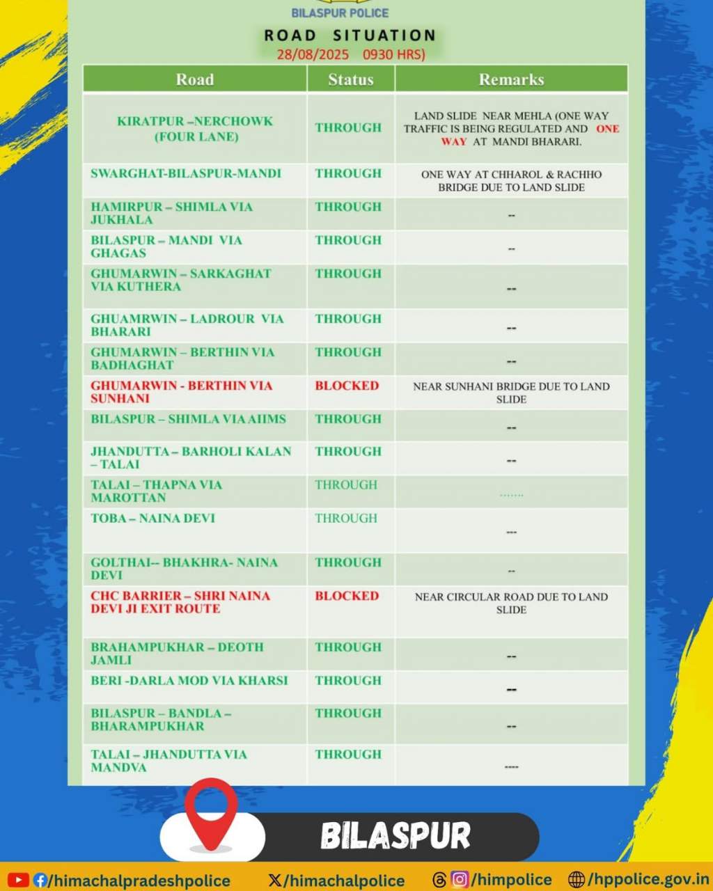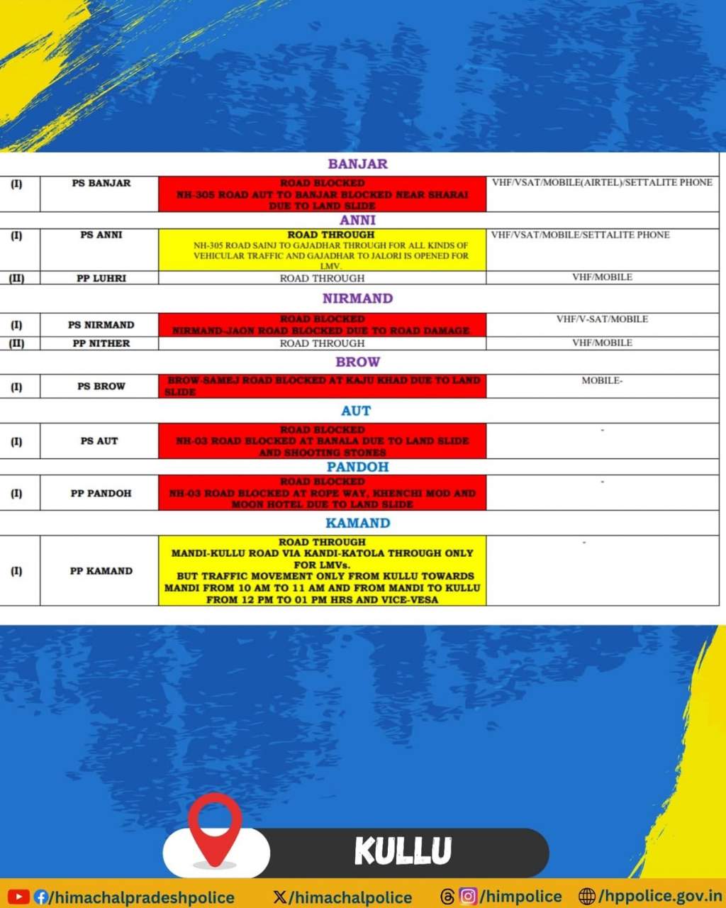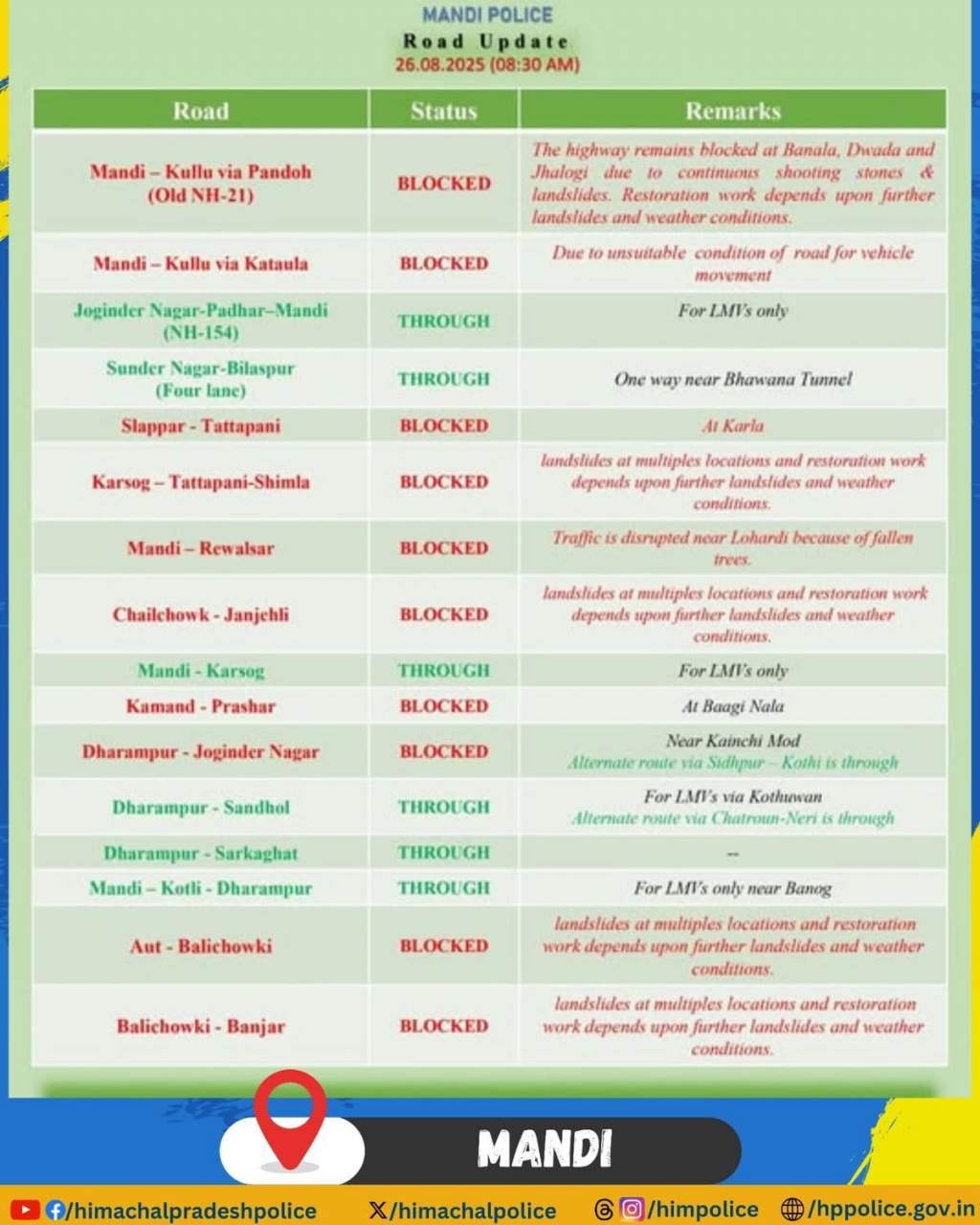 Из-за продолжительных дождей и сходов оползней заблокированы дороги в районах Биласпур, Манди, Куллу, Киннаур, Лахол-Спити и Нурпур.