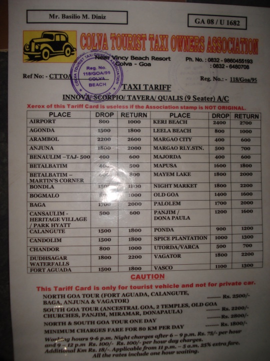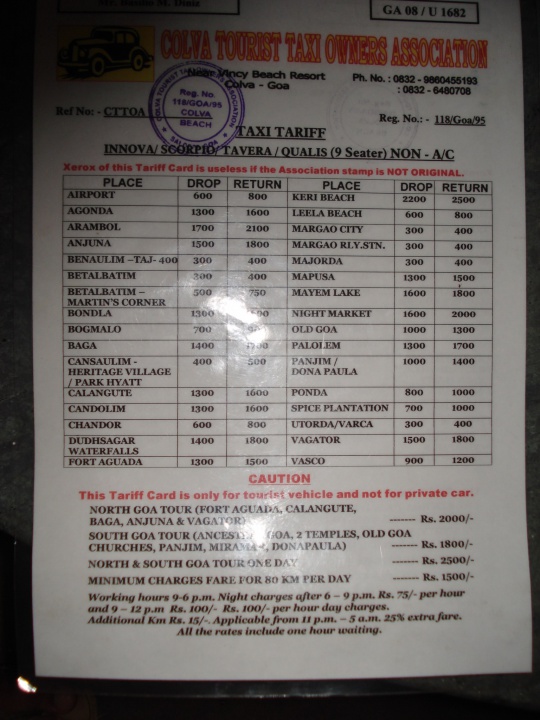 Южная Индия и Гоа › Такси в ГОА: актуальные реальные цены по направлениям |