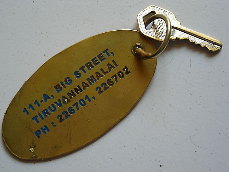 В Тируваннамалай приехал ночью и рикша по просьбе моего умного рта отвез мое уставшее в дороге тело в отель, где за 300 руписов ночной портье принял его на ночлег в комнату с нерабочим телевизором, холодным душем и размеренно похрустывающим феном на потолке:киууухрк-киуууухрк-киуууухрк. Но и это было сказкой после двух суток скитаний в небе, между небом и земльой и по самой земле. гостиница называлась " Ганеш Интернейшнл ". Фото ниже.