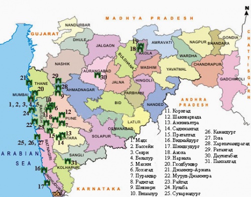 "...Всю территорию штата покрывает сеть старинных фортов, большая часть из которых - наследие Империи Великих Маратхов, но среди них также много и бывших колониальных укреплений, и крепостей, основанных другими древними династиями, правившими на этих землях в разное время. Всего в Махараштре более 550 фортов, 20 из которых находятся на побережье и прибрежных островах, и некоторые из них представляют собой поистине грандиозные сооружения. Среди них наиболее известны такие, например, как находящиеся в Мумбаи построенные португальцами форт Мадх (Версова) 17 века и форт Бассейн (Васай), располагающийся в пригороде Мумбая, в районе железодорожной станции Васай Роуд, форт Севри построенный британцами в 1680 году, форт Белапур, построенный династией Сидди из Джанджиры в 1570 году в районе современного Нэви Мумбаи, и форт Махим, захваченный португальцами в 1516 году. В районе Пуна самые известные - это форт Лохагад, взятый Шиваджи в 1648 году, форт Пурандар, основанный ещё в 1350 году Бахманским султаном, форт Раджгад, бывшая столица Империи Маратхов, форт Шивнери, где великий Шиваджи родился и провёл своё детство, форт Вишапур, воздвигнутый первым пешвой Империи Маратхов в 1720 году, форт Коригад, взятый Шиваджи в 1657 году, и форт Шаниварвада, построенный пешвами в 1732 году. В районе Сатара это форт Ажинкьятра 16 века, с которого открывается захватывающий дух панорамный вид на всю Южную Махараштру, форт Саджжангад, переданный Шиваджи индуистскому святому 17 века Свами Самартху Рамдасу, и ставший его духовным центром, а также форт Пратапгад, построенный в 1656 году по приказу Шиваджи. В районе Шиндхудург это массивные островные форты Виджайдург и Шиндхудург, построенные Шиваджи в конце 17 века. В районе Акола - одноимённый форт, впервые серьёзно укреплённый могольским императором Аурангзебом в 1697 году, и форт Нарнала, также известный как Шаханур, основанный наследниками династии Пандава задолго до 1400 года. В районе Тхане - форт Гходбундер, построенный португальцами в 1730 году, и островной форт Джанжир-Арнала, основанный гуджаратцами в 1516 году. В районе Райгад - грандиозный островной форт Муруд-Джанжира, воздвигнутый правителями Коли в 14 веке, форт Райгад, бывший с 1674 года столицей империи Шиваджи и место, в котором великий правитель и воин был коронован, и форт Кулаба, построенный им в 1652 году. В районе Ратнагири - островной форт Суварнадург и его береговые меньшие братья Гова и Канакдург, воздвигнутые султаном Биджапура, и захваченные Шиваджи в 1660 году. В районе Ахмеднагар это древний форт Харишчандрагад, основанный в 6 веке, во времена правления династии Кальчури, и форт Ратангад, построенный более 400 лет назад, и захваченный в последствии Шиваджи. В районе Аурангабад весьма интересен город-форт 14 века Даулатабад, когда-то называвшийся Деогири, ставший в 1327 году столицей династии Туглаков. В районе Колхапур - форт Панхала или Панхалгад, построенный династией Шилахара в конце 12 - начале 13 веков. Но все эти замечательные исторические достопримечательности - лишь малая толика из длинного списка фортов Махараштры, каждый из которых по своему интересен и достоин посещения, несмотря на то, что многие из них сейчас находятся в крайне плачевном состоянии от воздействия времени, климата и человеческой деятельности..."