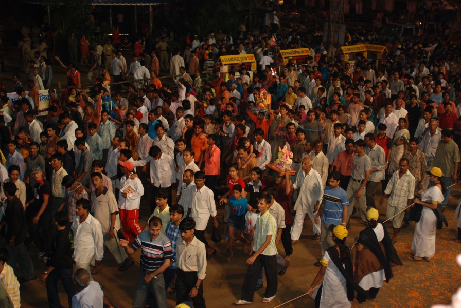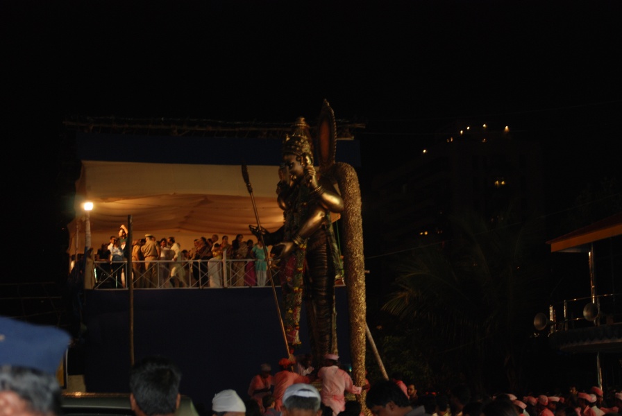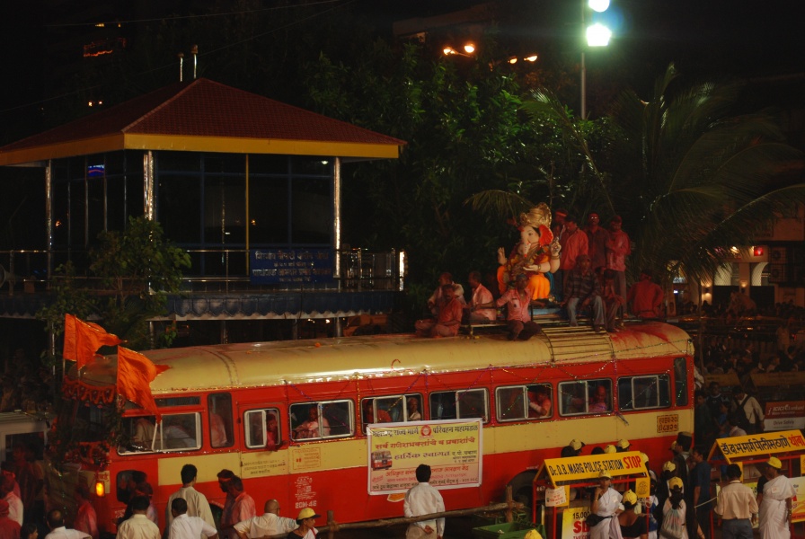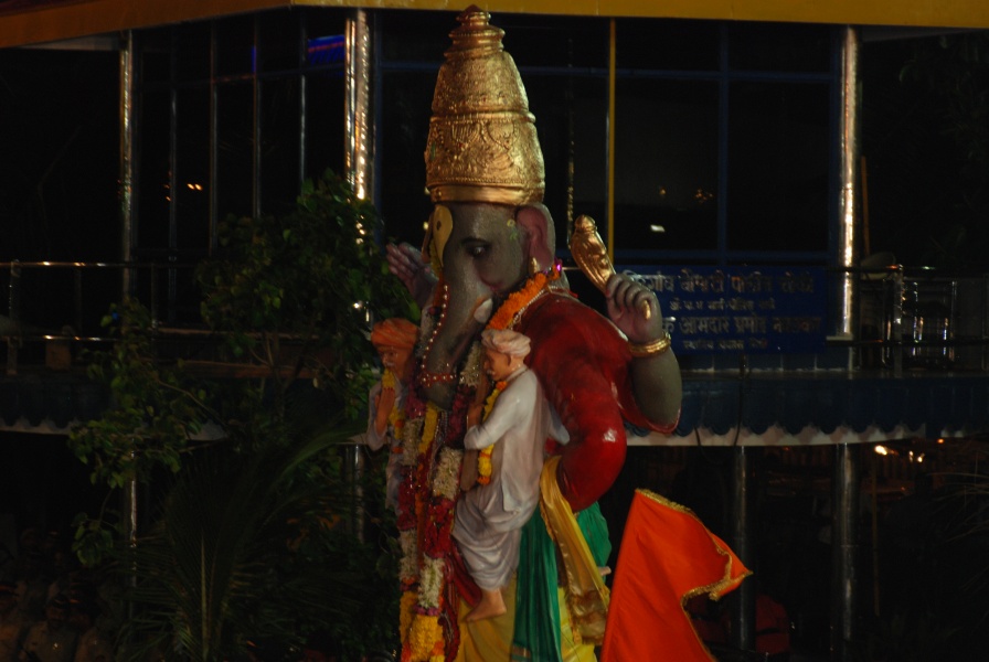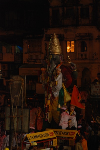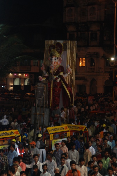 Среди всей этой красоты нескончаемым потоком, в грохоте барабанов, оглушительных разрывах петард и реве музыки по-прежнему плыл нескончаемый людской поток, который на подходе к набережной безумолчно свистящие в штатные стальные свистки полицейские по одному им ведомому признаку снова делили на дворовые и уличные команды. Впереди каждой образовавшейся процессии большие группы крепких, разукрашенных цветными красками мужичков, словно оживляя известное полотно русского художника-«передвижника» «Бурлаки на Волге», делали вид, что тянут за длинные - метров по пятнадцать – веревки какую-нибудь платформу (тележка, грузовичек, огромная фура, автобус и пр.), с установленным на ней многометровым изваянием Слоноголового Господа Ганеша. Как бы отчет района об успехах в соцсоревновании в минувшем полугодии на первомайской демонстрации в восьмидесятых...