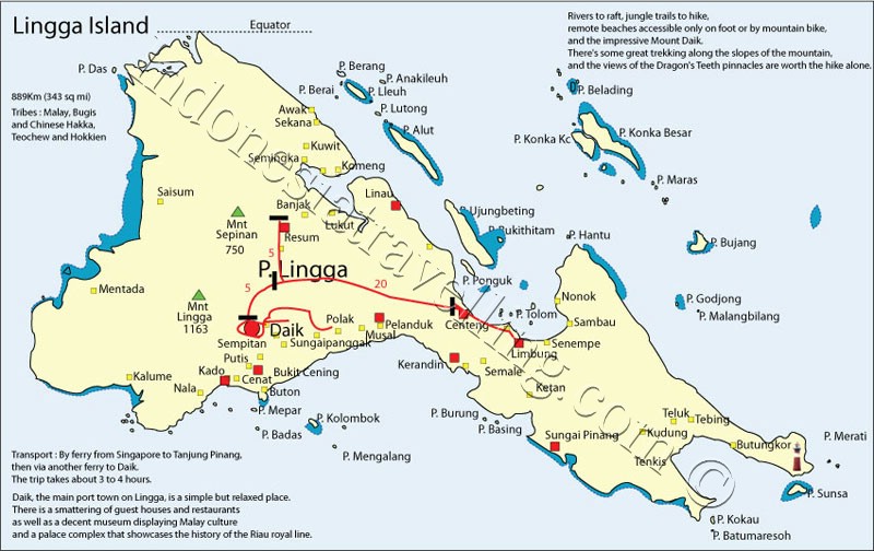 Есть цель погулять по экватору с минимальными вложениями %-) Из всех островов пока выбор падает на Пулау Лингга, потому что до него относительно просто и недорого добираться на паромах из Сингапура через острова Batam или Bentan.