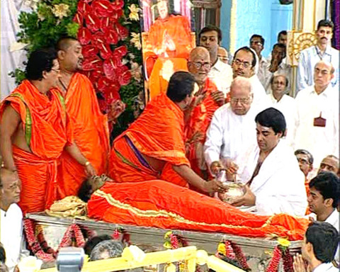 Once the last rites were performed by the many Vedic pundits, the red curtains were drawn at around 9:45 AM and the process started for laying Swami's Physical body in a pit, After about 40 Minutes, The curtains were removed for the people to have a glimpse of the Samadhi where Swami's Physical body was laid to rest.