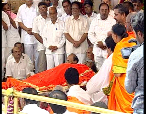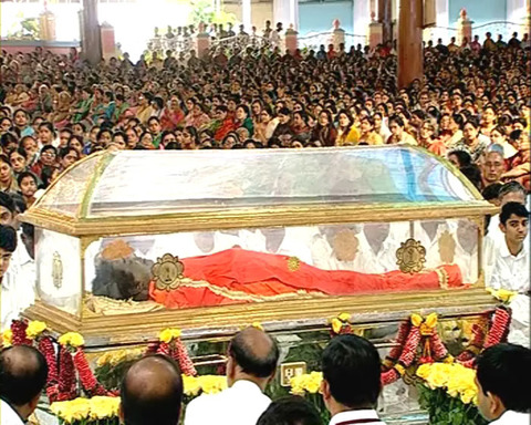...Как только последние ритуалы были выполнены ведическими пандитами, красный занавес был опущен приблизительно в 9:45 утра, и начался процесс опускания тела в могилу на том месте в Саи Кульвант холле....