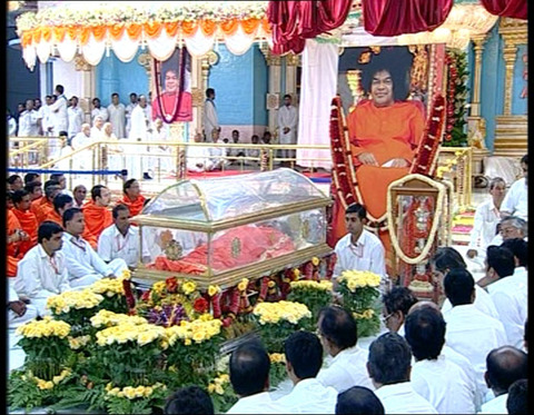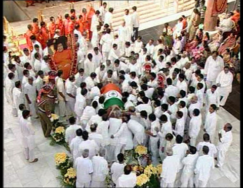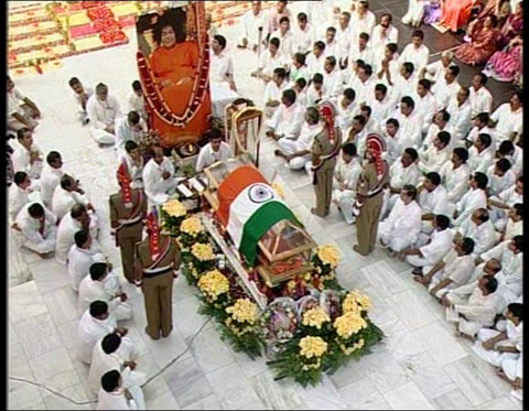 Earlier, a little before 9 AM, the glass casket in which Bhagawan's Physical Body was kept for Final Darshan was removed and was wrapped in national flag for a brief while. Men of the Andhra Pradesh Armed Police sounded the last post and fired 21 shots in the air as a mark of respect. Then the Tricolour was removed and verses from Hindu, Christian, Islamic, Sikh, Judaism and Buddhist scriptures were read out by leaders from these sects. Later, The Divine Mangala Aarti' was performed.