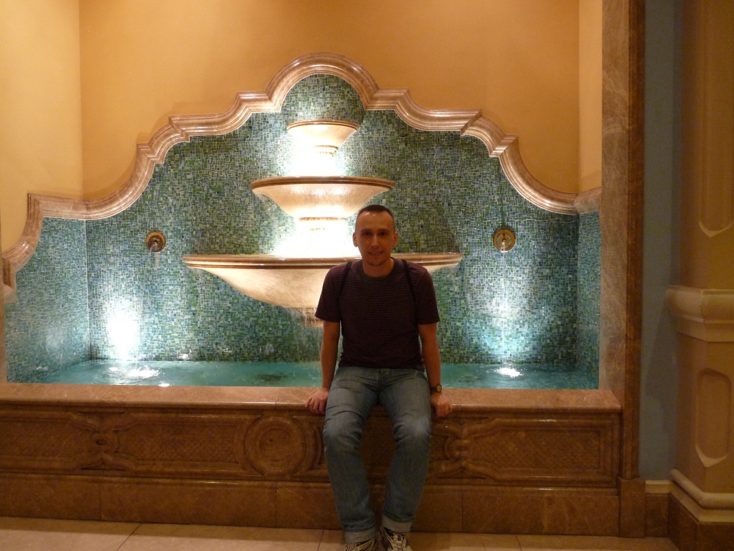 Впечатление очень положительное- город очень понравился! Единственное, не повезло с погодой- маловато фоток из-за дождя. Но гулять нам дождь не мешал) Выйдя из номера, начали с площади, затем по указателям дошли до останков стены-церкви (не буду сейчас рыться в названиях, вы поймёте о чём я говорю), а затем пошли по главной улице до казино. Нашли казино Winn с музыкальными фонтанами, посмотрели два представления- опять же мелкий дождь мешал расслабиться и посидеть на лавочке- не хотелось сидеть в мокром и мокнуть под дождём. Поэтому поехали в казино Venetian Венеция. Это сказка, особенно для тех, кто никогда не был в казино, а это я с друзьями. Просто ходишь и балдеешь! А какие залы игровых автоматов огромные, сколько там людей- мамма-мия!