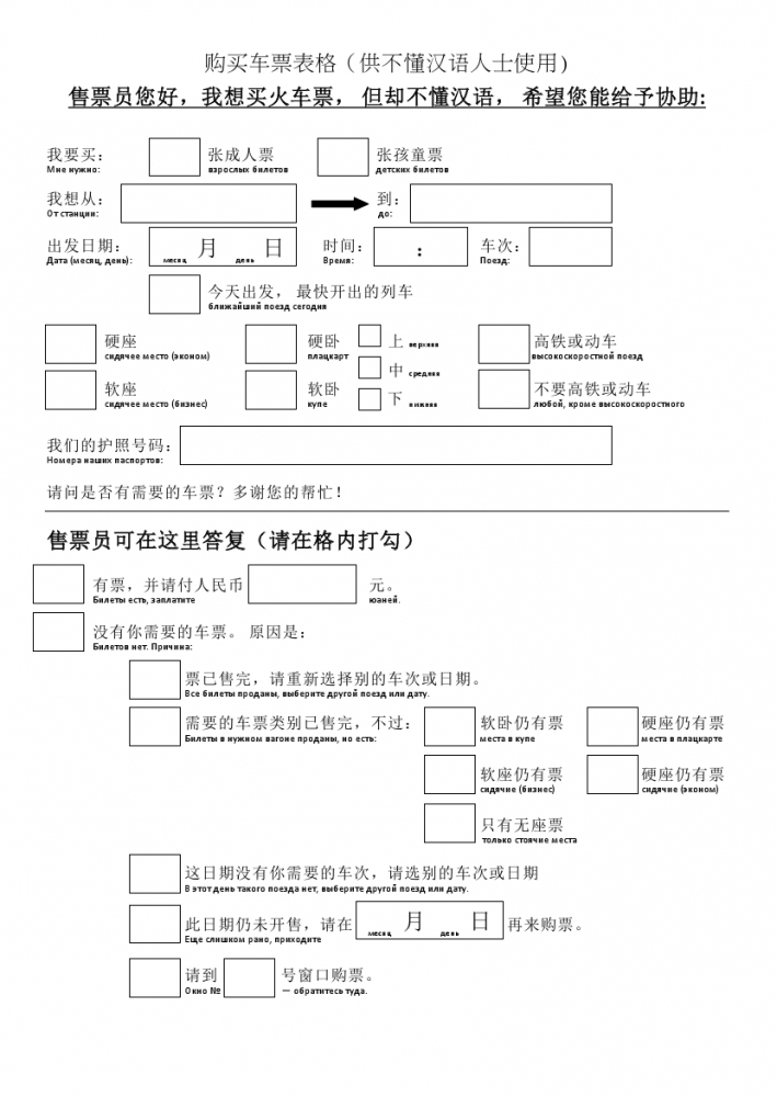 Есть такая табличка, с ней удобно билет на поезд покупать. Верхняя часть для покупателя, нижняя для ответа кассира