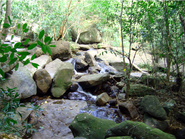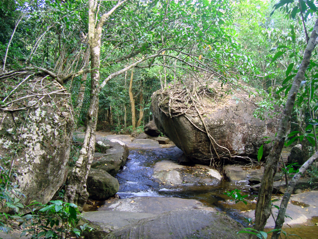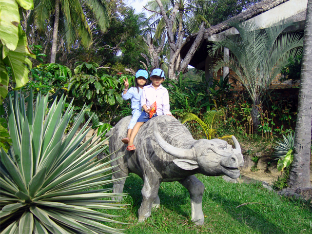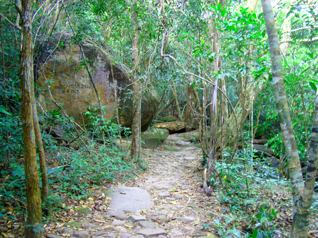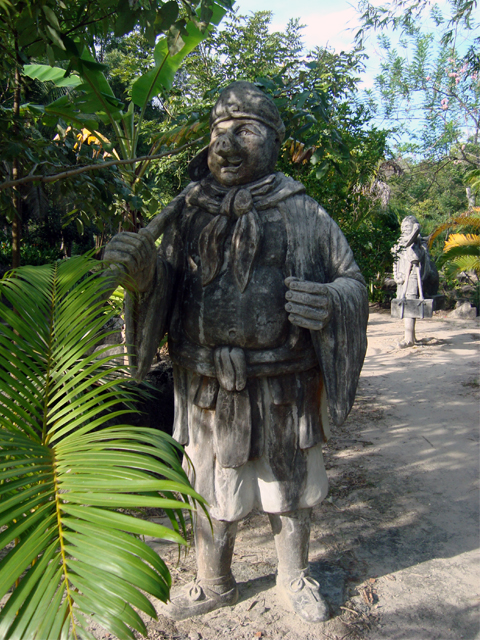 Доезжаем до тропы — снова вокруг множество довольно примитивных скульптур, на сей раз древних вьетнамцев, очень ухоженный парк и спускающийся с гор ручей. Вход на тропу, естественно, не бесплатный — около $0,2. Каменная тропа идет вверх вдоль горного ручья; часто останавливаемся, фотографируем, пару раз краем глаза замечаем какое-то движение в лесу — наверное, грызун. Услышали впереди лай собак и решили развернуться. Доезжаем до города Duong Dong, оттуда домой и снова идем купаться на закате.