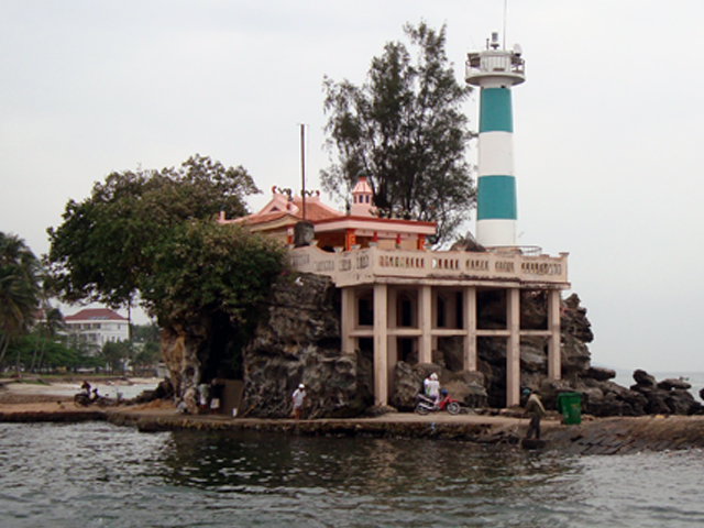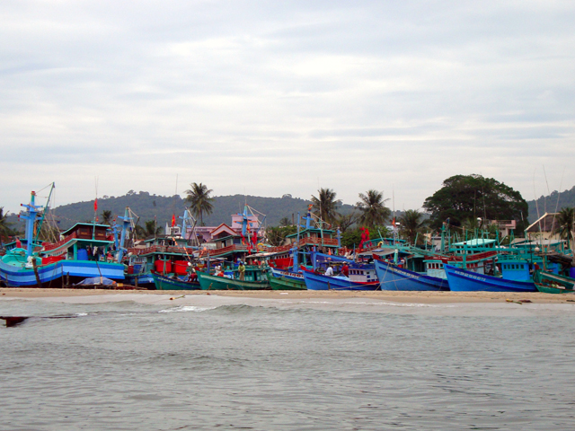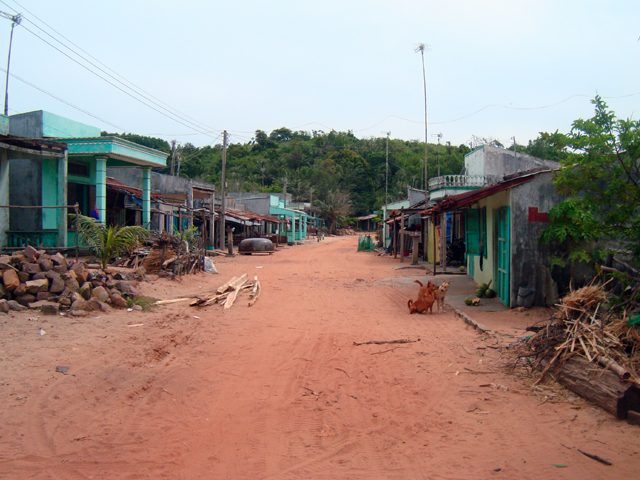 Все время едем вдоль того самого 20-километрового пляжа Long Beach. Он действительно long, но никак не wide – от трех до пяти метров шириной, а между ним и дорогой — невероятная смесь из кокосовых пальм, кактусов, лиственниц, опавших листьев, кокосов и строительного мусора. В конце концов доезжаем до южной оконечности Фу Куока — порта Ан Тхой. Ничего особенного — грязно, пара тысяч человек населения и характерная портовая вонь.