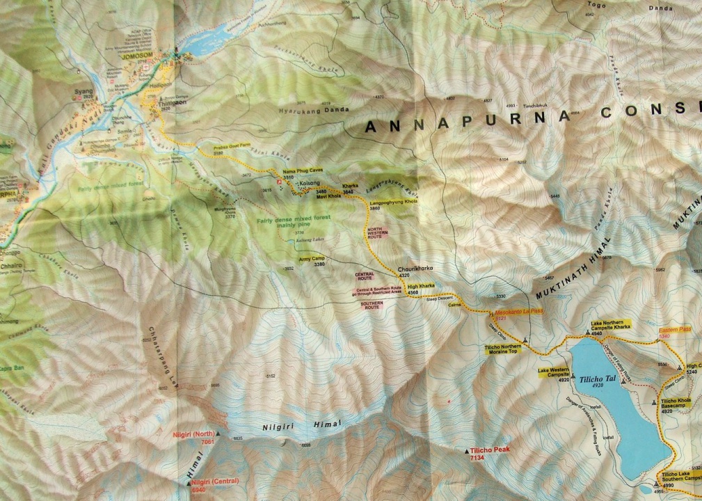 Это свежая карта Тиличе из тамельского книжного магазина. Ниже Месоканту в сторону Марфы нарисованы еше 2 тропы, южная и центральная. На местности их не видно. Скорее всего, ими обозначены (по крайней мере в самом вверху) просто "хорошие" места для прохода. Немного смущает Army Camp на средней тропе. Сверху ничего там не видно. Вероятно непальские картографы в очередной раз ошиблись. В действительности, Army Camp находится там, где написано "Kaisang".