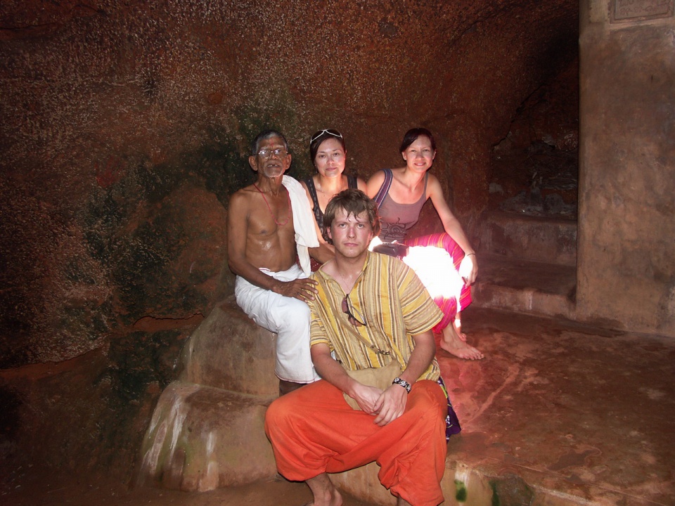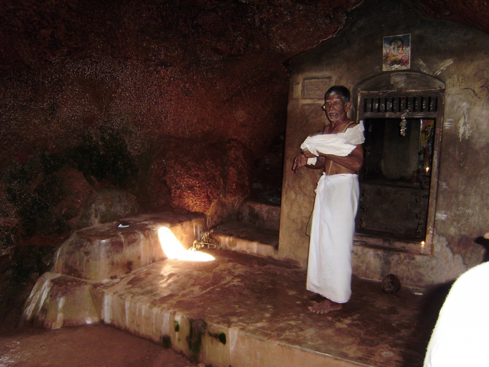 Утром покушали и пошли осматривать местность. Дойдя до пляжа, познакомились с брахманом, и он предложил нам совершить пуджу в пещере, где родился Шива. Сводил нас к храму, где живут брахманы, к храму Нагайны, а потом на пустырь к пещере. Вошли внутрь – а там огромная пещера с маленьким храмом и Шивалингамом. Живут летучие мышки. По дороге собрали цветы, листья и кокос. Все это пожертвовали лингаму. Брахман стал служить пуджу. Потом показал интересную вещь, если сеть на камень рядом с храмом с белой тканью в руках, то свет, который падает из отверстия в потолке, отражается на стены, и стены покрываются разными светящимися знаками и рисунками.