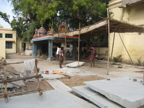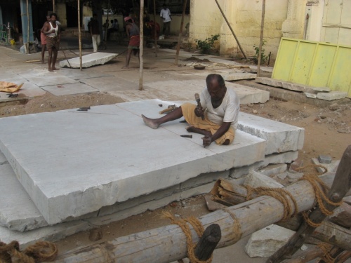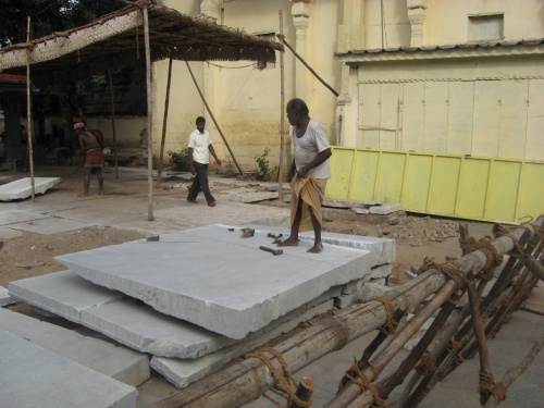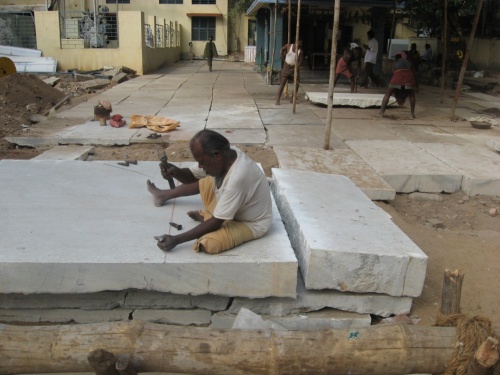 В одном из двориков стояли верблюды. Чуть дальше рабочие мостили тротуар. Вот это интересно! Достаю фотоаппарат, босые люди, толкающие ломами толстую каменную плиту, размером полтора на два метра, сразу бросают это занятие, и машут мне руками. Снова берутся за ломы, и продолжают передвигать плиту на место ее установки. Представляю, как босой палец случайно попадает под неровные края плиты ... чувствую, как у меня в сандалиях чешутся ногти. Лучше об этом не думать. Примериваюсь, чтобы сфотографировать человека, который зубилом отбивает по намеченной линии от большой плиты куски меньшего размера. Такие, как тот, что сейчас передвигают его товарищи. Они снова бросают свое занятие, и весело кричать что-то этому человеку. Наверное, говорят ему, что он теперь кинозвезда. Он принимает меня как неотвратимый внешний фактор, от товарищей своих отворачивается, и недовольно начинает цокать молотком по зубилу. Сделав удар, передвигает зубило на несколько сантиметров, снова удар. Когда он по, намеченной красным, линии дойдет до края, кусок, на котором он сидит, отвалится. Так пилят сук, на котором сидят. Мне очень понравился этот рабочий, и реакция этих людей. Почему они так рады нас видеть? Может все-таки из-за моей белой футболки? Нужно будет завтра одеть другого цвета, и сравнить. А плиты то, похожи на мрамор... Не зря пошли в храм, такое увидеть!