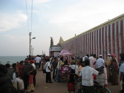 Ребята успели посетить храм вчера, сейчас собирались в музей Ганди. Мы договорились встретиться у них в гостинице в 11 утра, и вместе выехать в Каньякумари. Попрощавшись, мы отошли к забору возле входа в храм, держась за прутья, сняли обувь и засунули в пустой рюкзак. Стоять босыми ногами на камне было на удивление тепло. Веками, температура здесь ниже 25 градусов не падает, даже зимней ночью, вот и тепло.